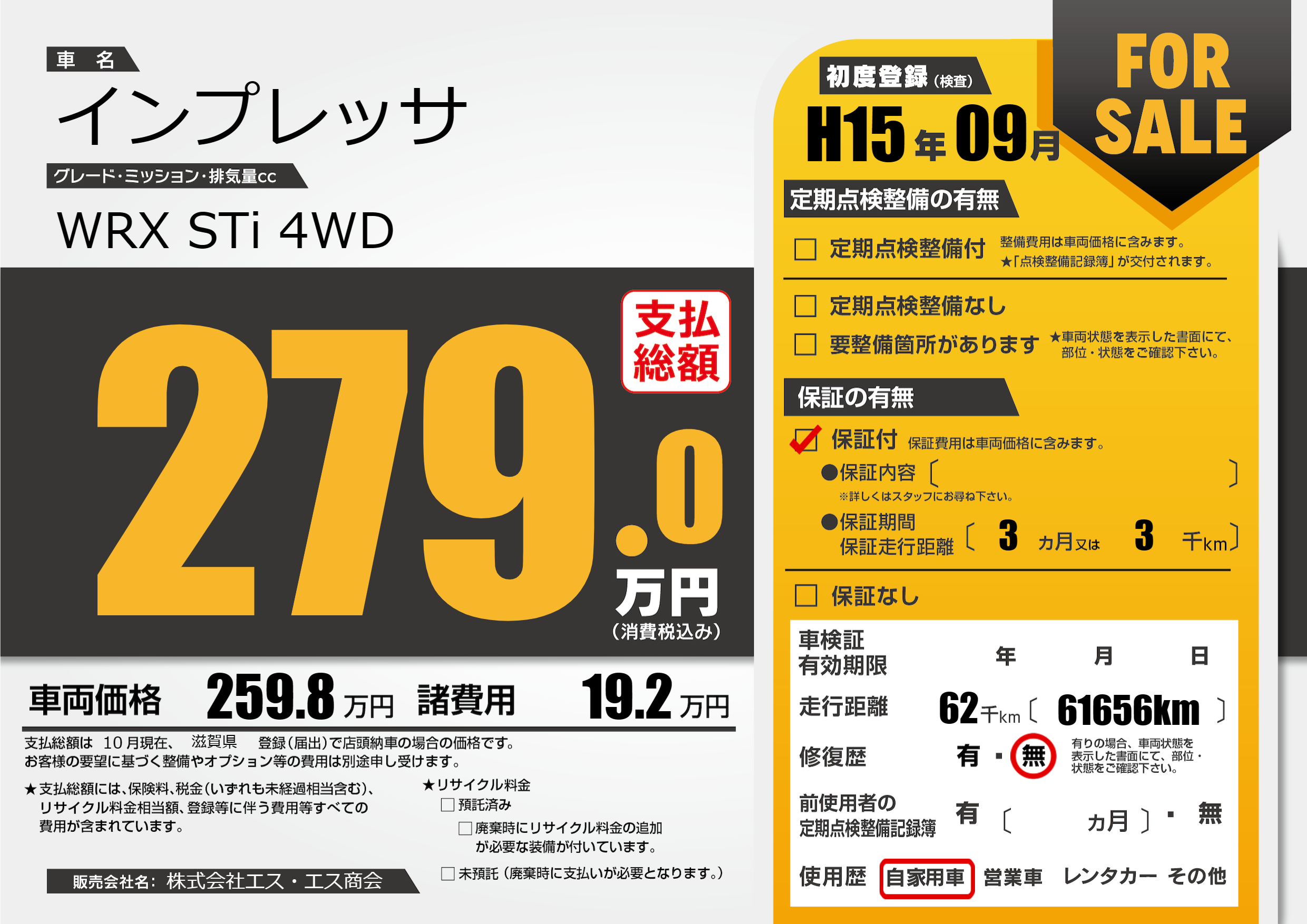 | 車名 | インプレッサ | グレード ミッション 排気量 |