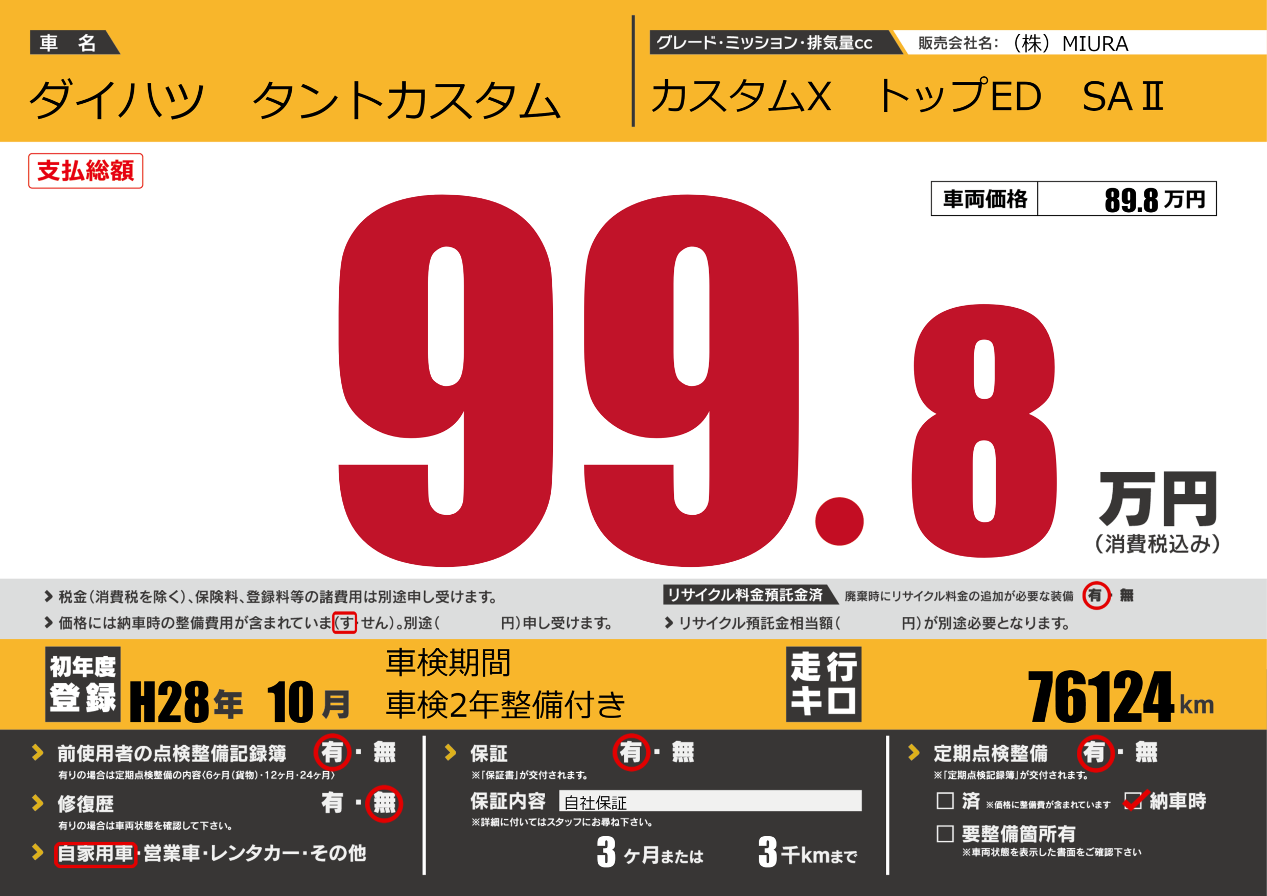 保証付き 保証内容(自社保証) 3ヶ月または3千km |