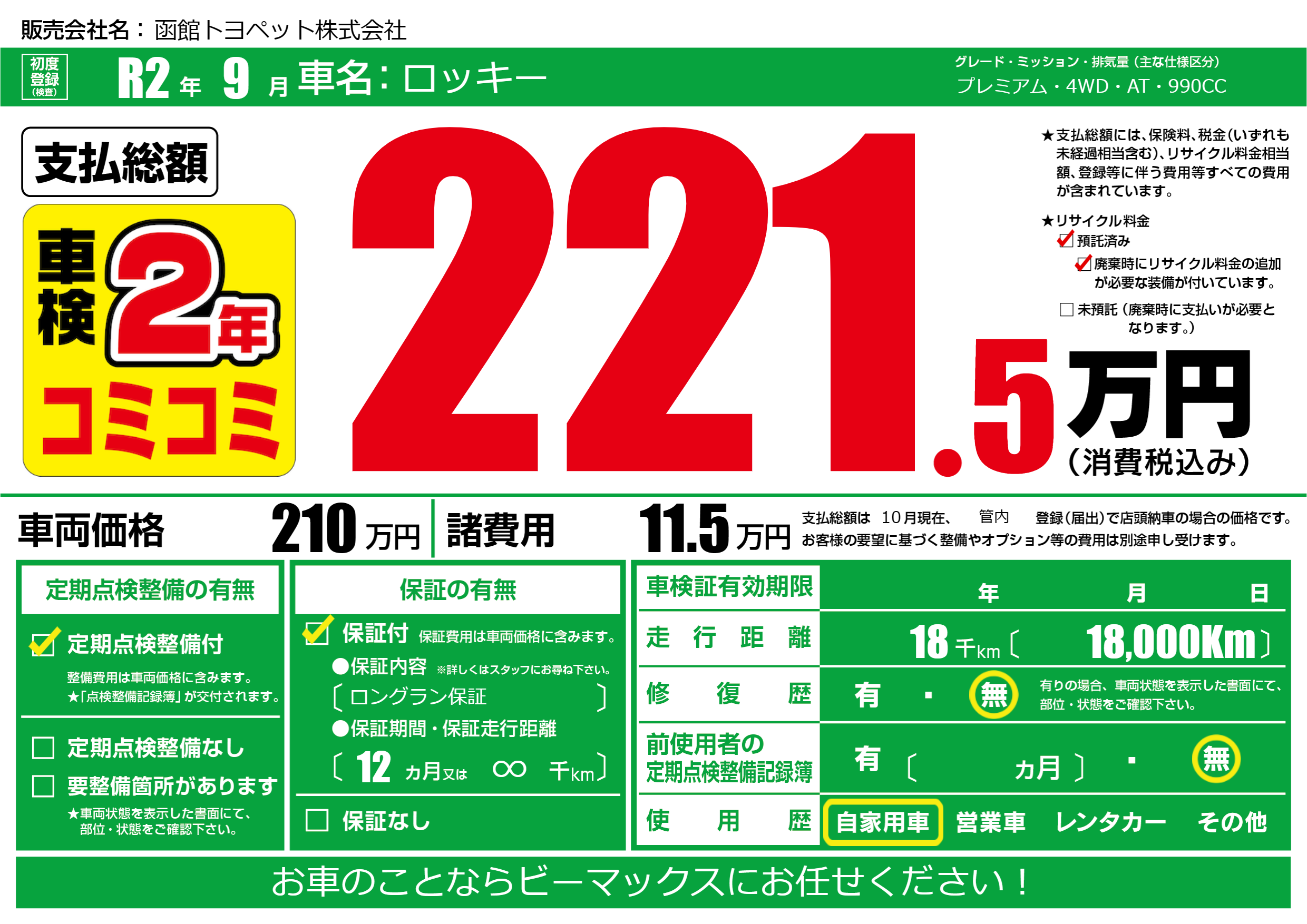 | 走行キロ | 1.8万km | 初年度登録 | R2年9月 |