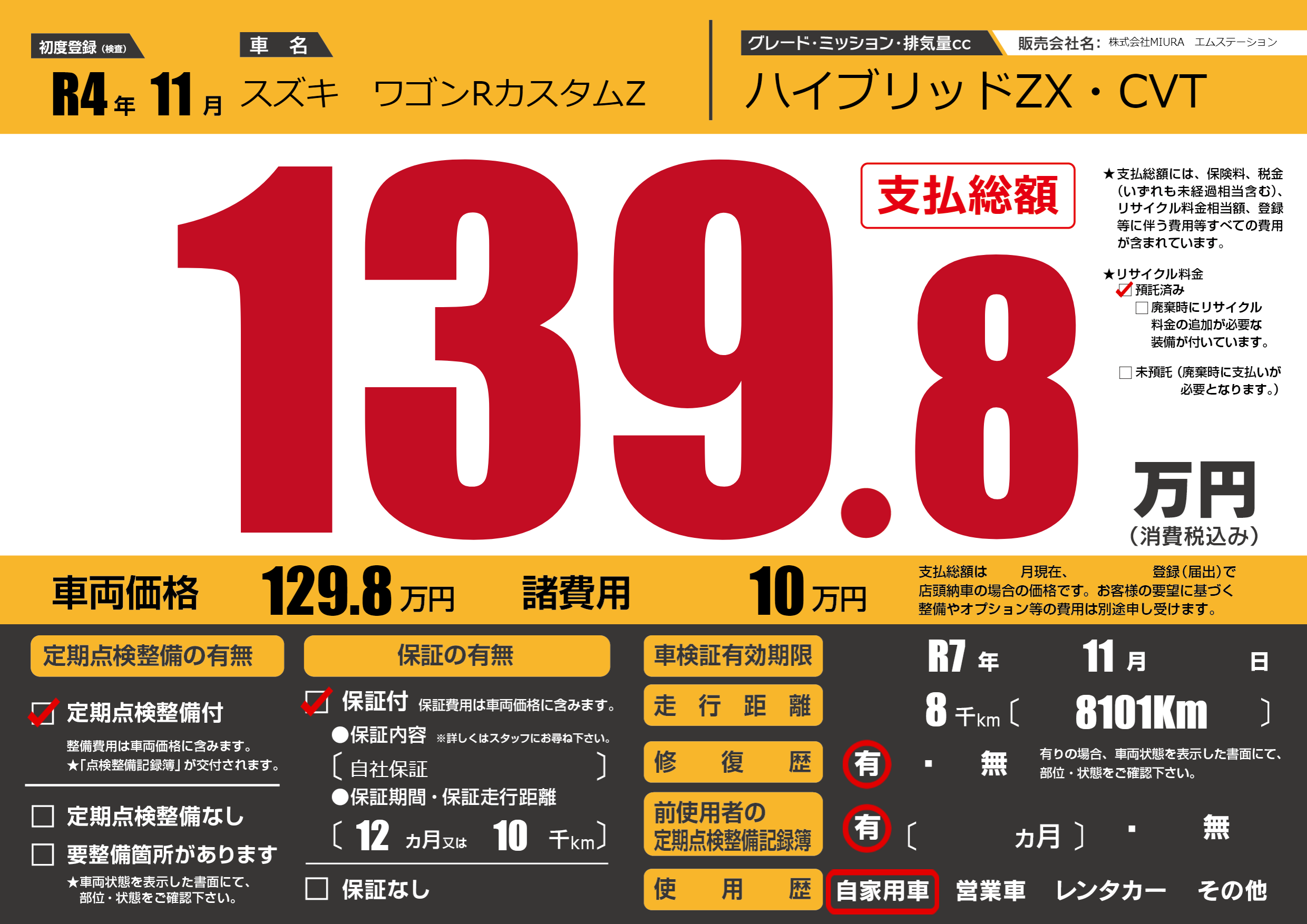 | 走行キロ | 0.8万km | 初年度登録 | R4年11月 |