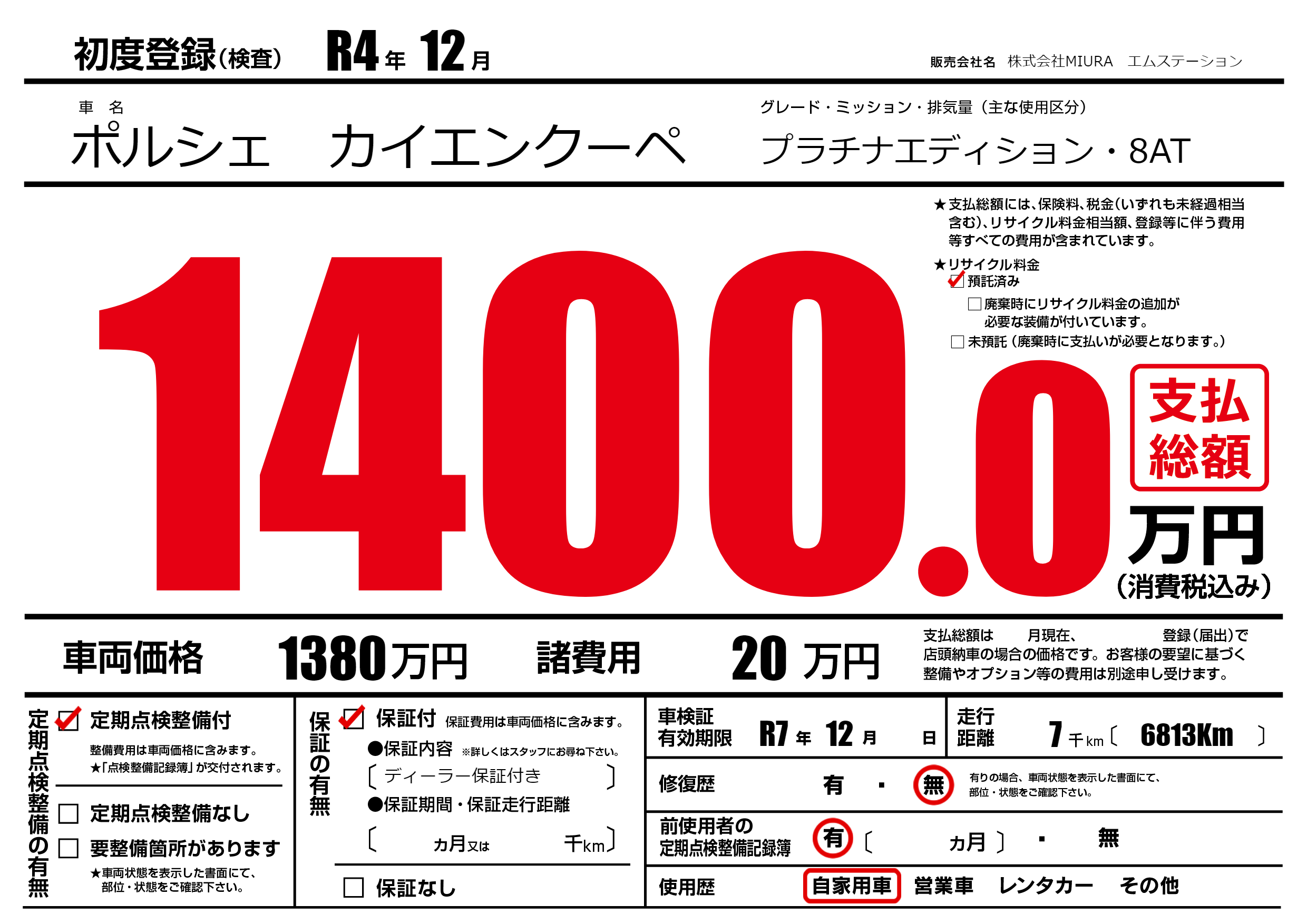 | 車名 | ポルシェ カイエンクーペ | グレード ミッション 排気量 |