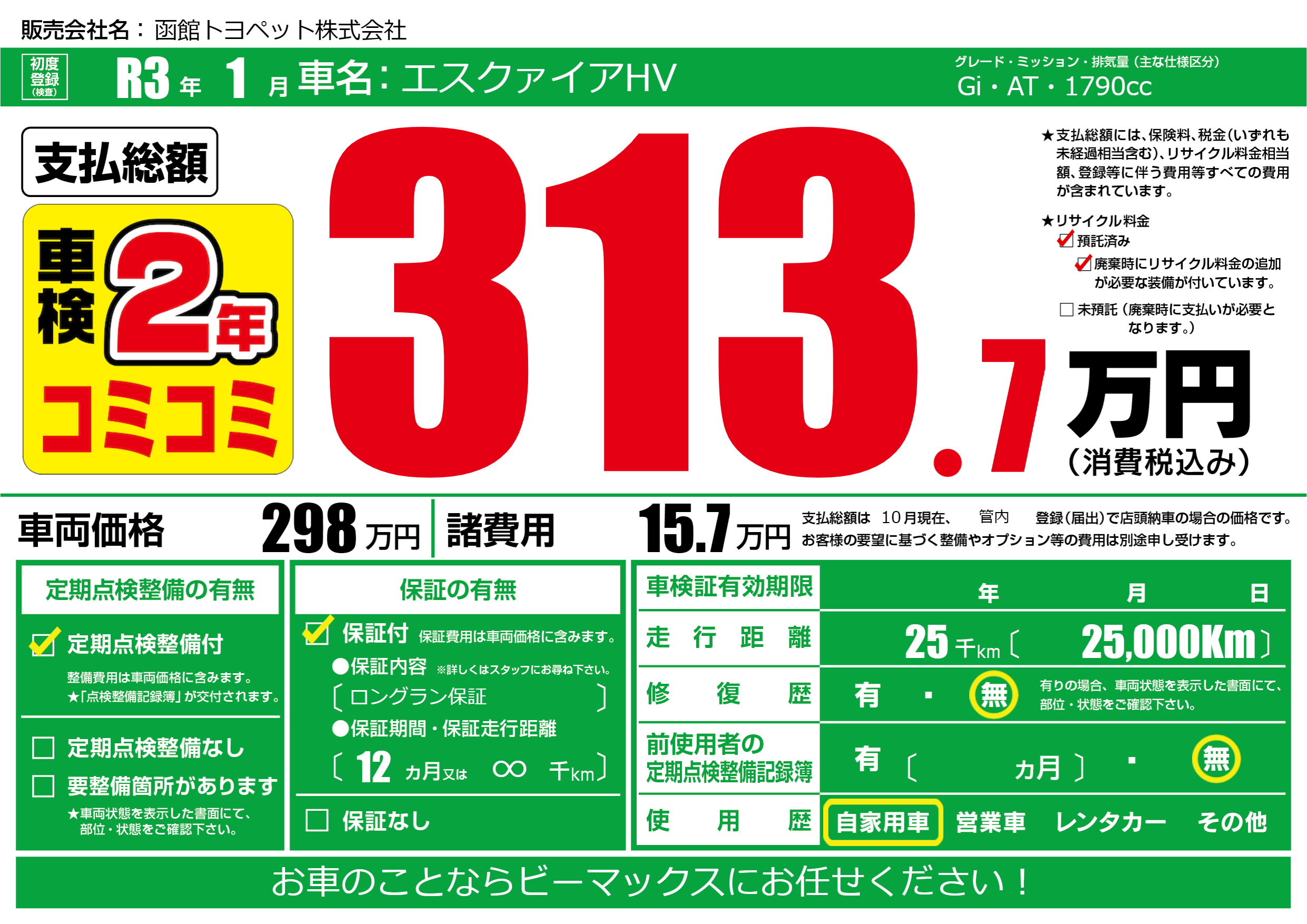 | 走行キロ | 2.5万km | 初年度登録 | R3年1月 |