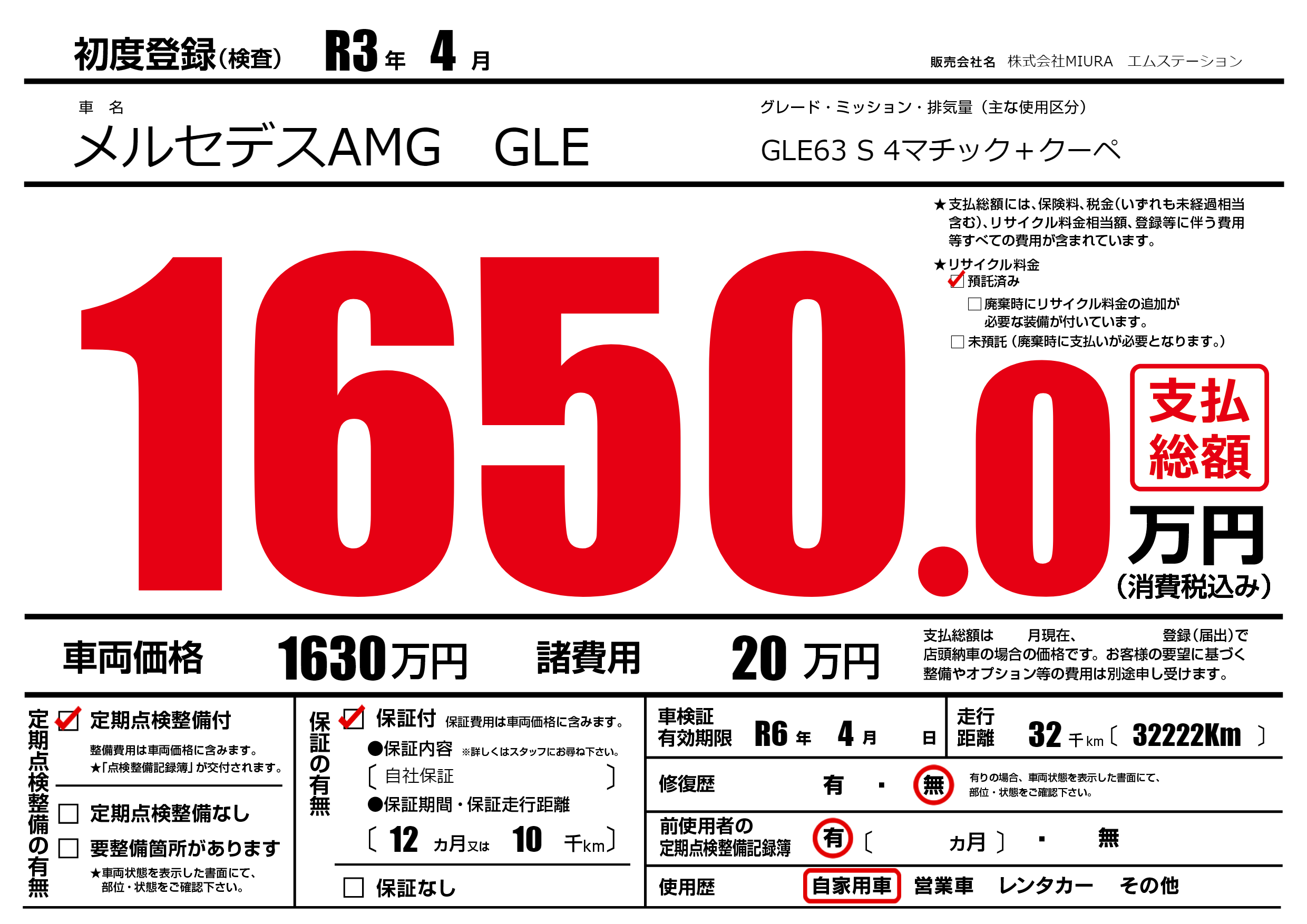 | 車名 | メルセデスAMG GLE | グレード ミッション 排気量 |