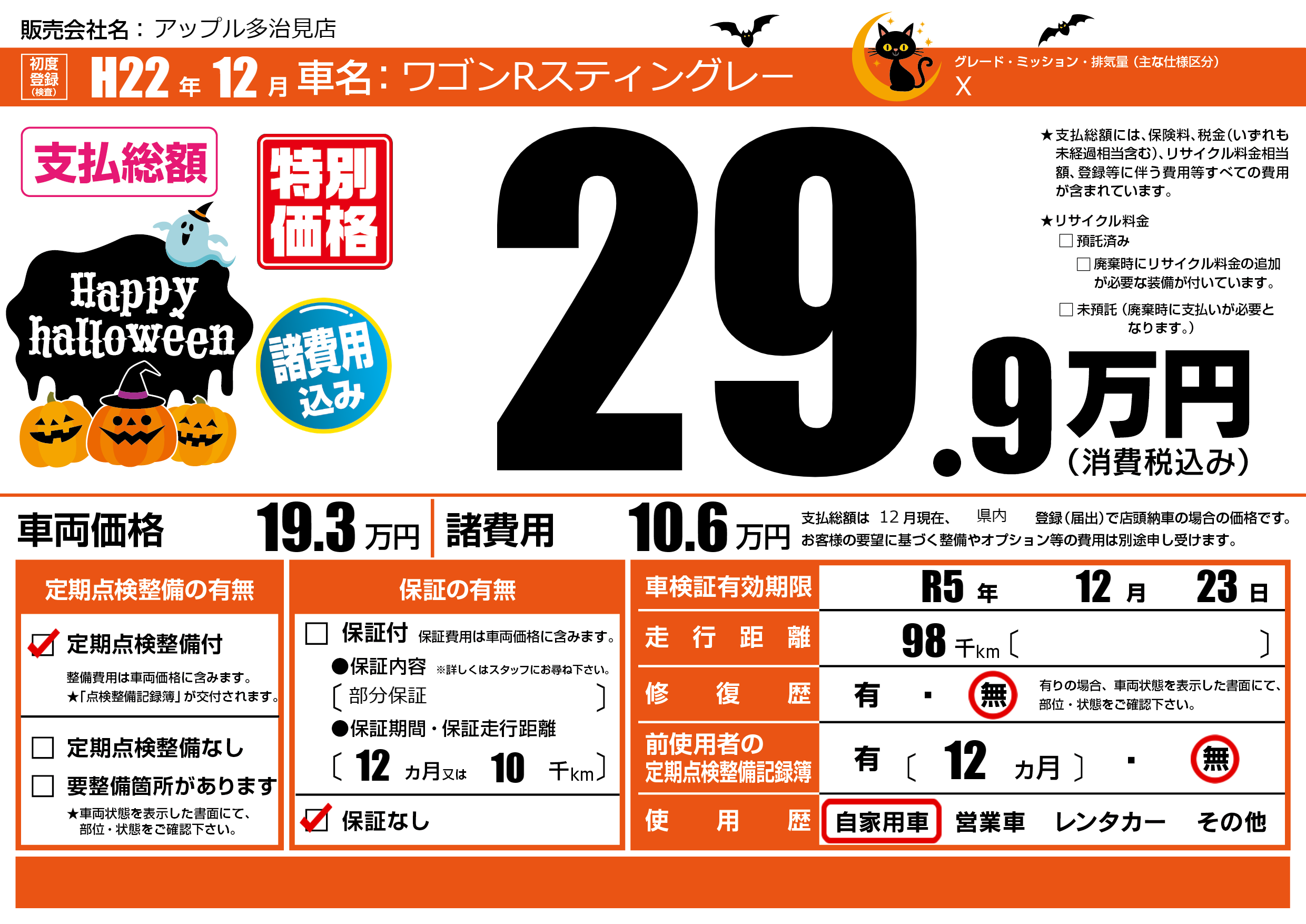 | 走行キロ | 9.8万km | 初年度登録 | H22年12月 |