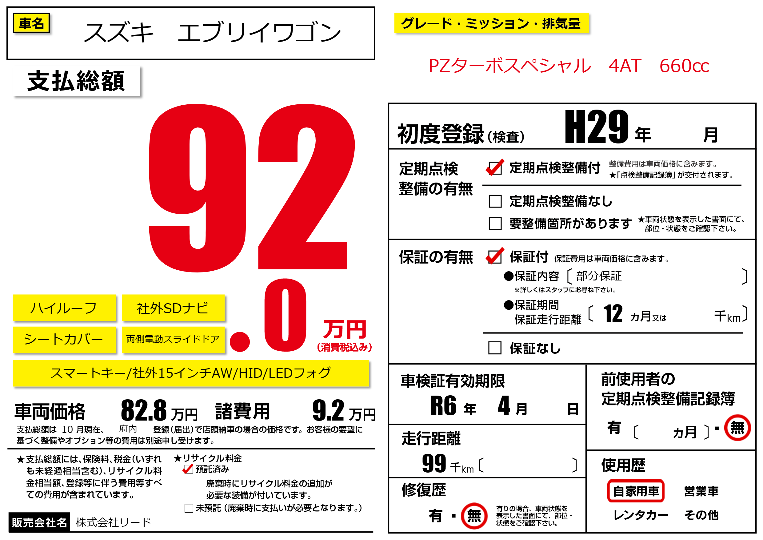 | 車名 | スズキ エブリイワゴン | グレード ミッション 排気量 |