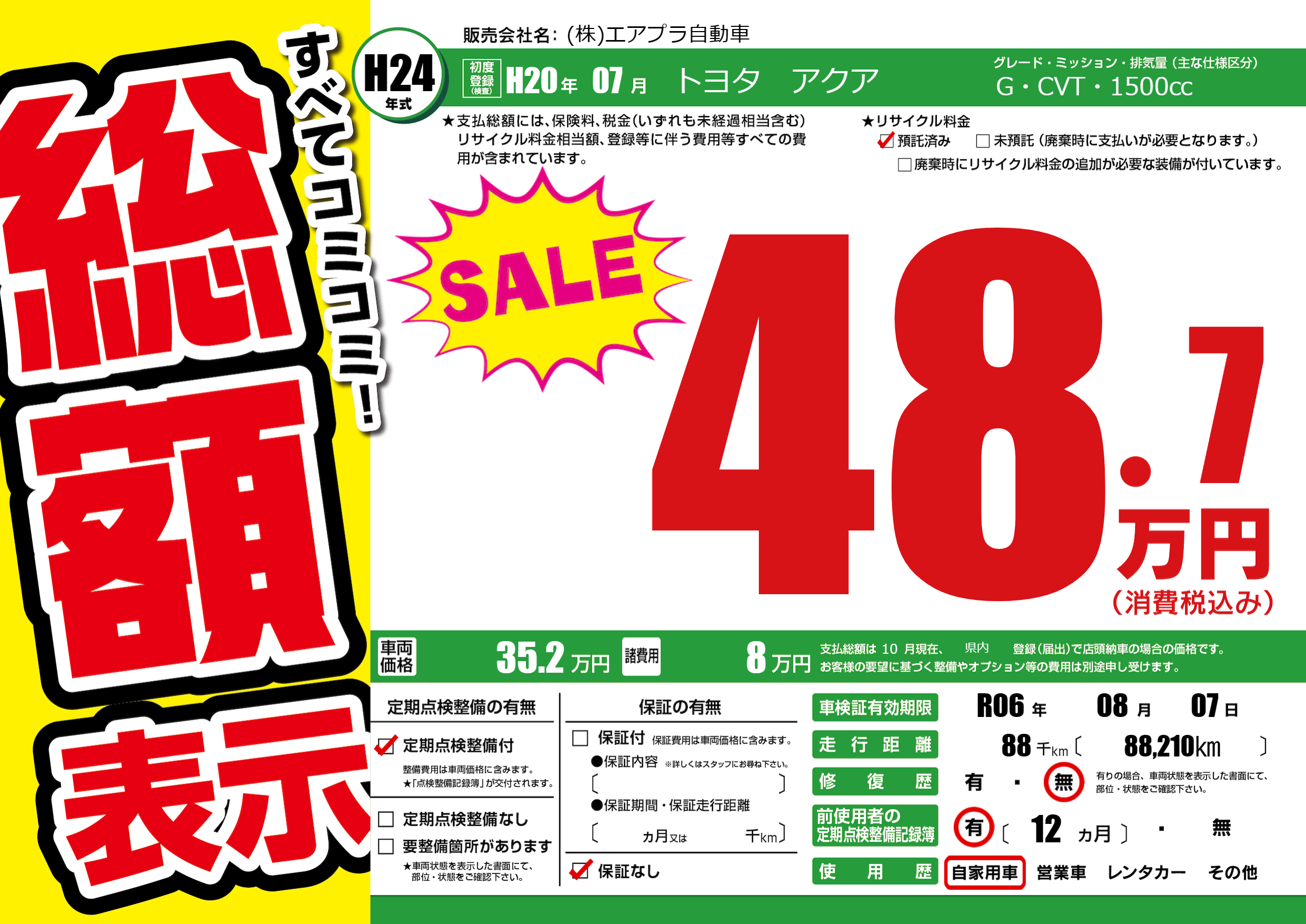 | 車検制限 | R06年 08月 07日 | ||