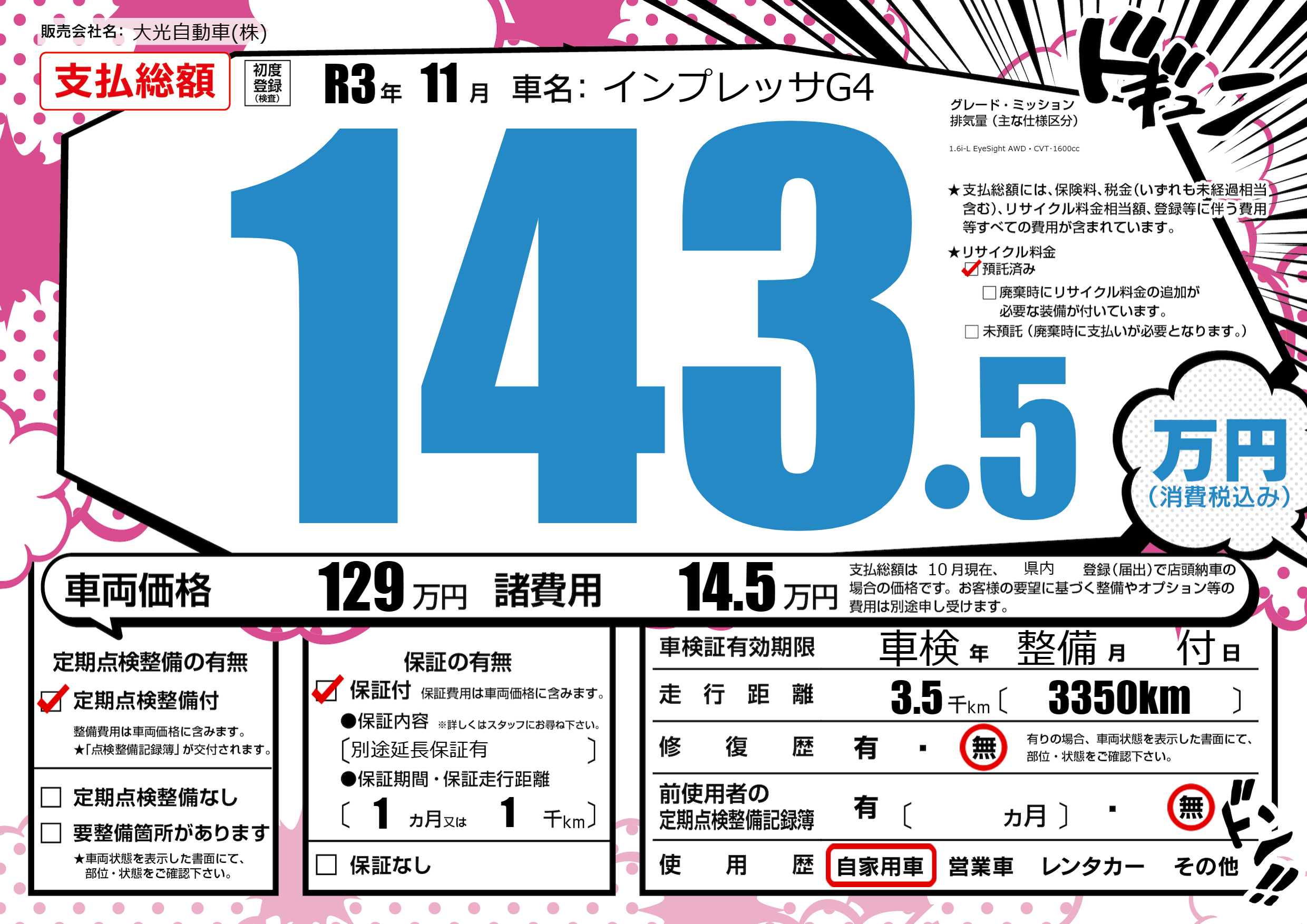 | 車名 | インプレッサG4 | グレード ミッション 排気量 |