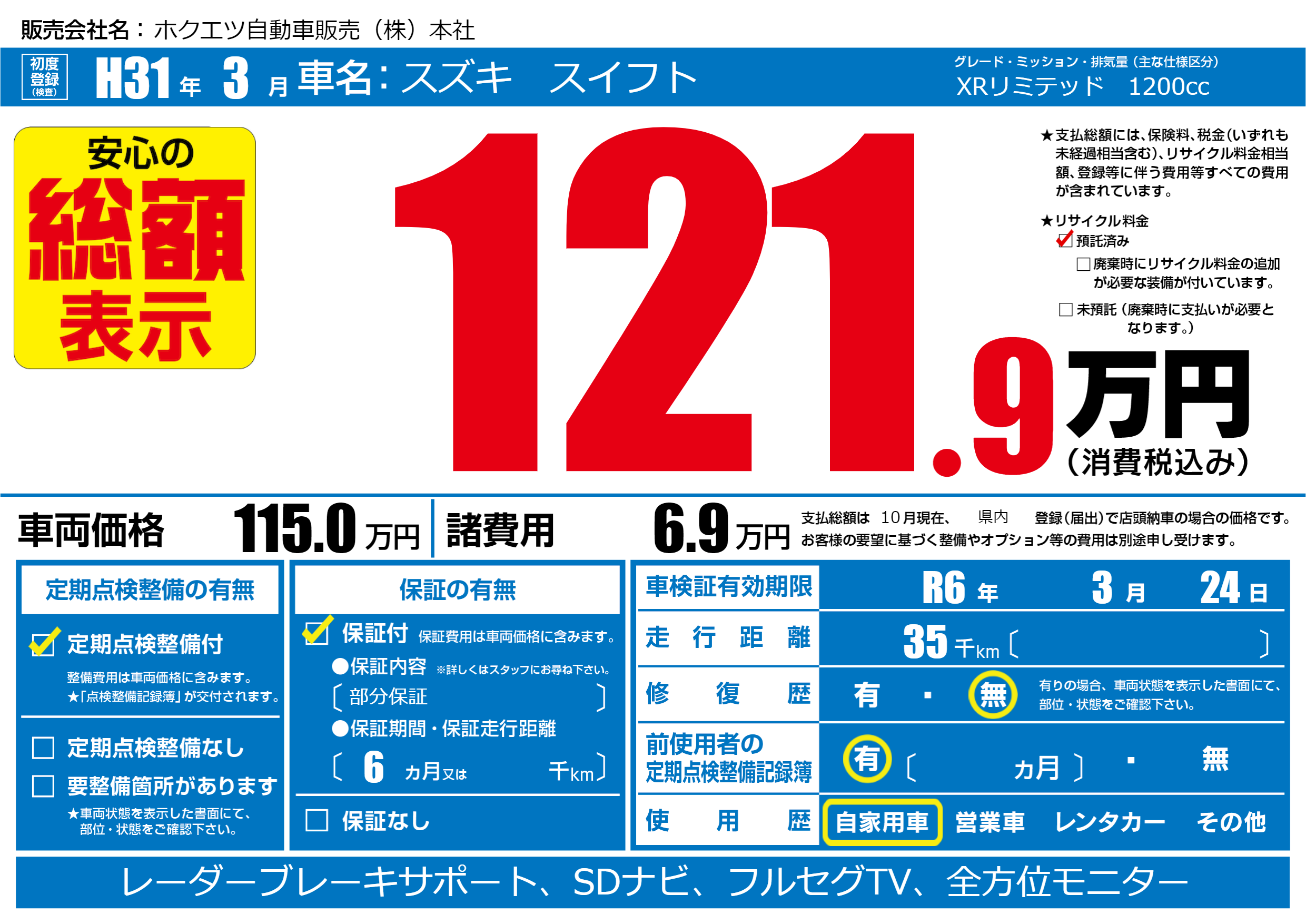 | 車名 | スズキ スイフト | グレード ミッション 排気量 |