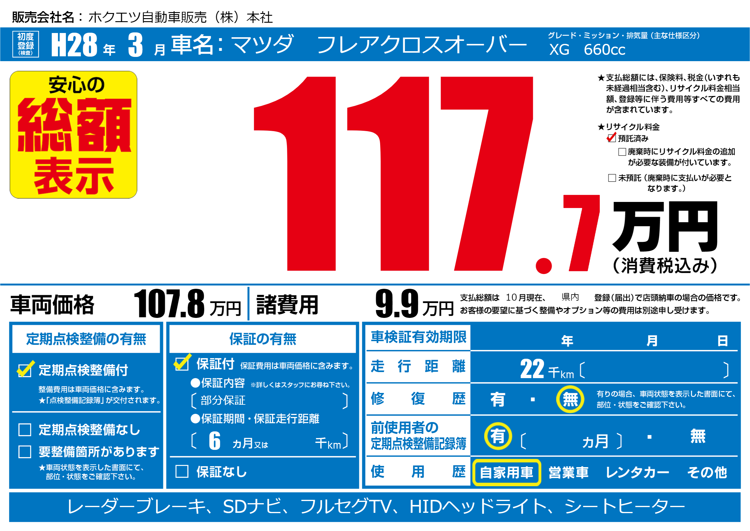 | 走行キロ | 2.2万km | 初年度登録 | H28年3月 |