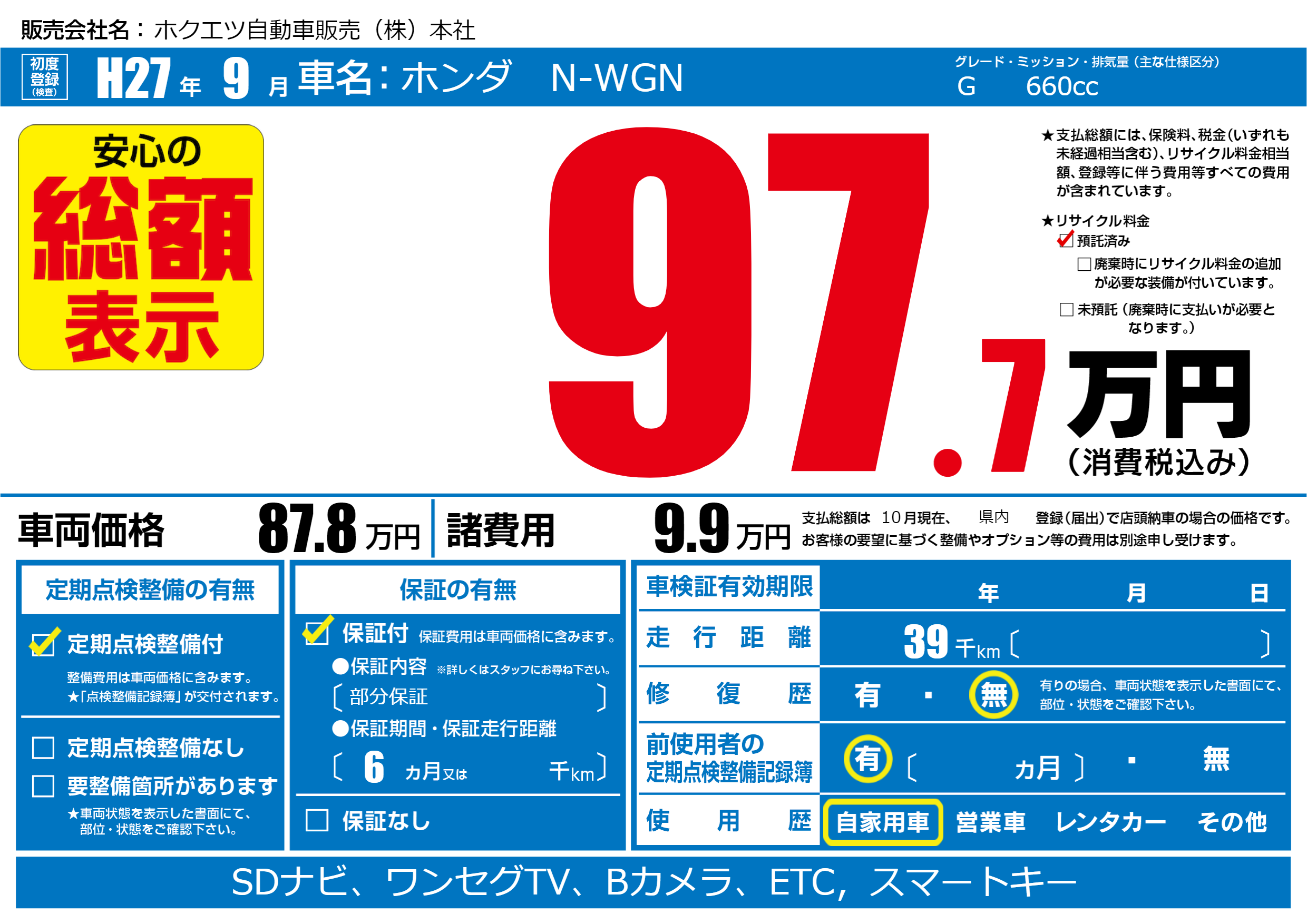 | 車名 | ホンダ N-WGN | グレード ミッション 排気量 |