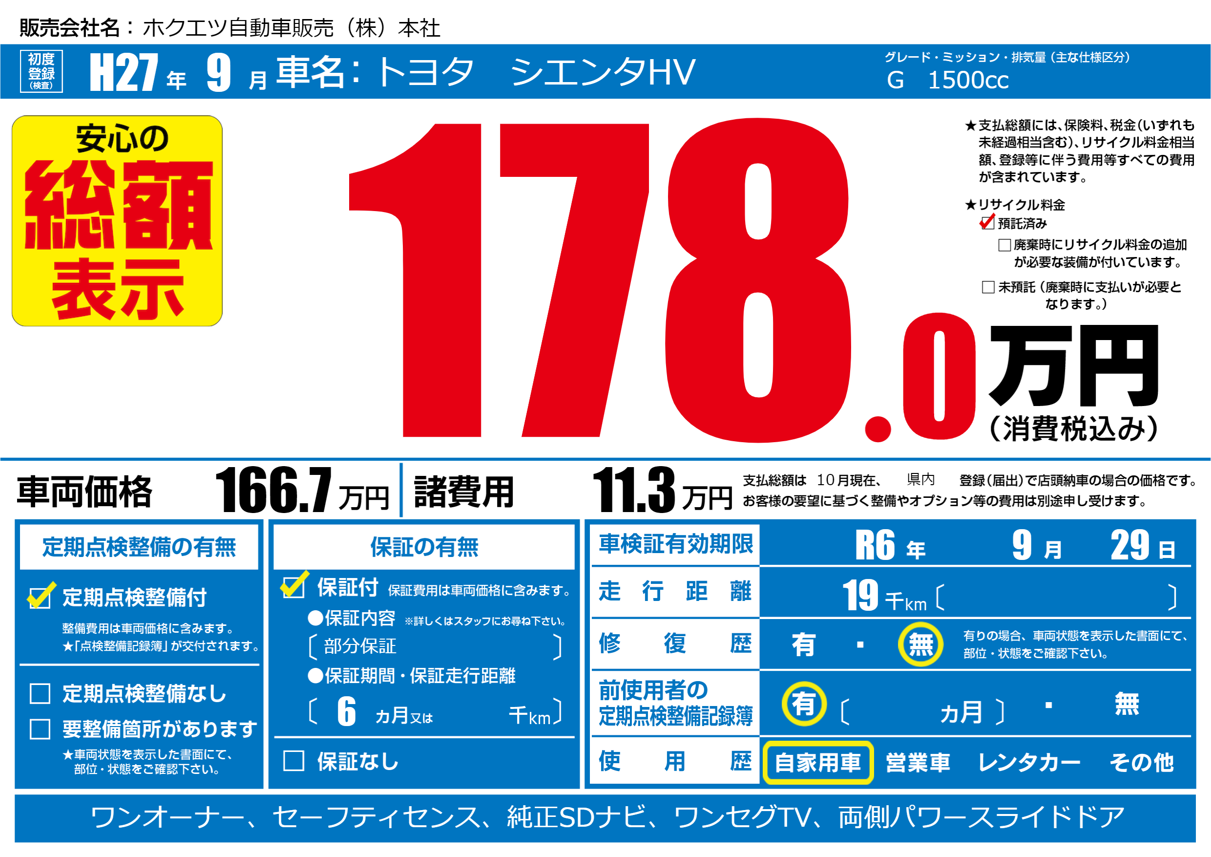 | 車名 | トヨタ シエンタHV | グレード ミッション 排気量 |