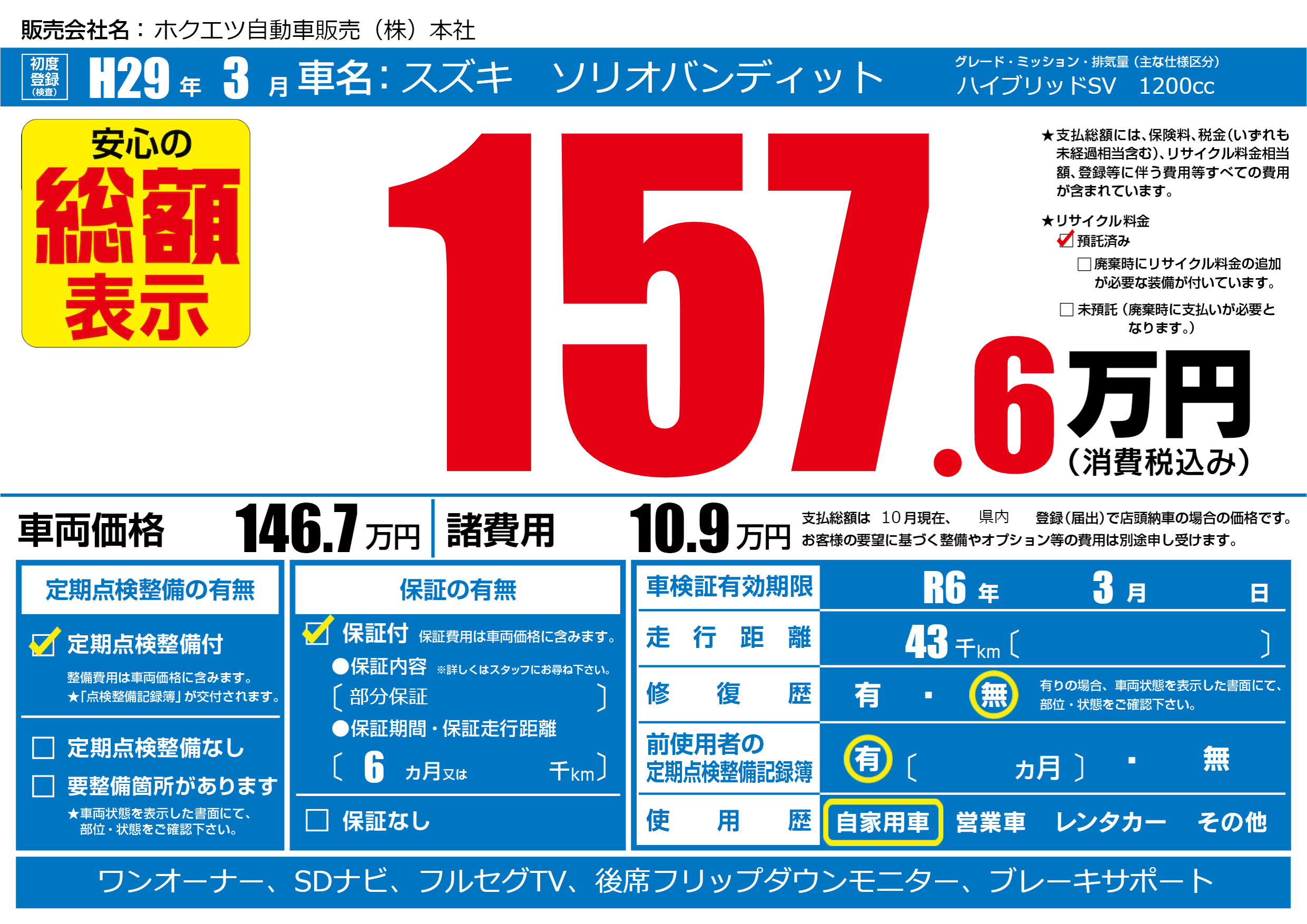| 車名 | スズキ ソリオバンディット | グレード ミッション 排気量 |