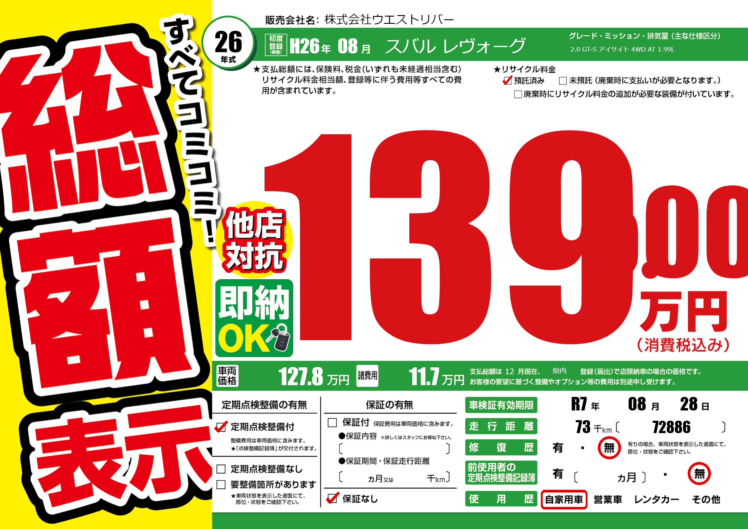 | 車名 | スバル レヴォーグ | グレード ミッション 排気量 |