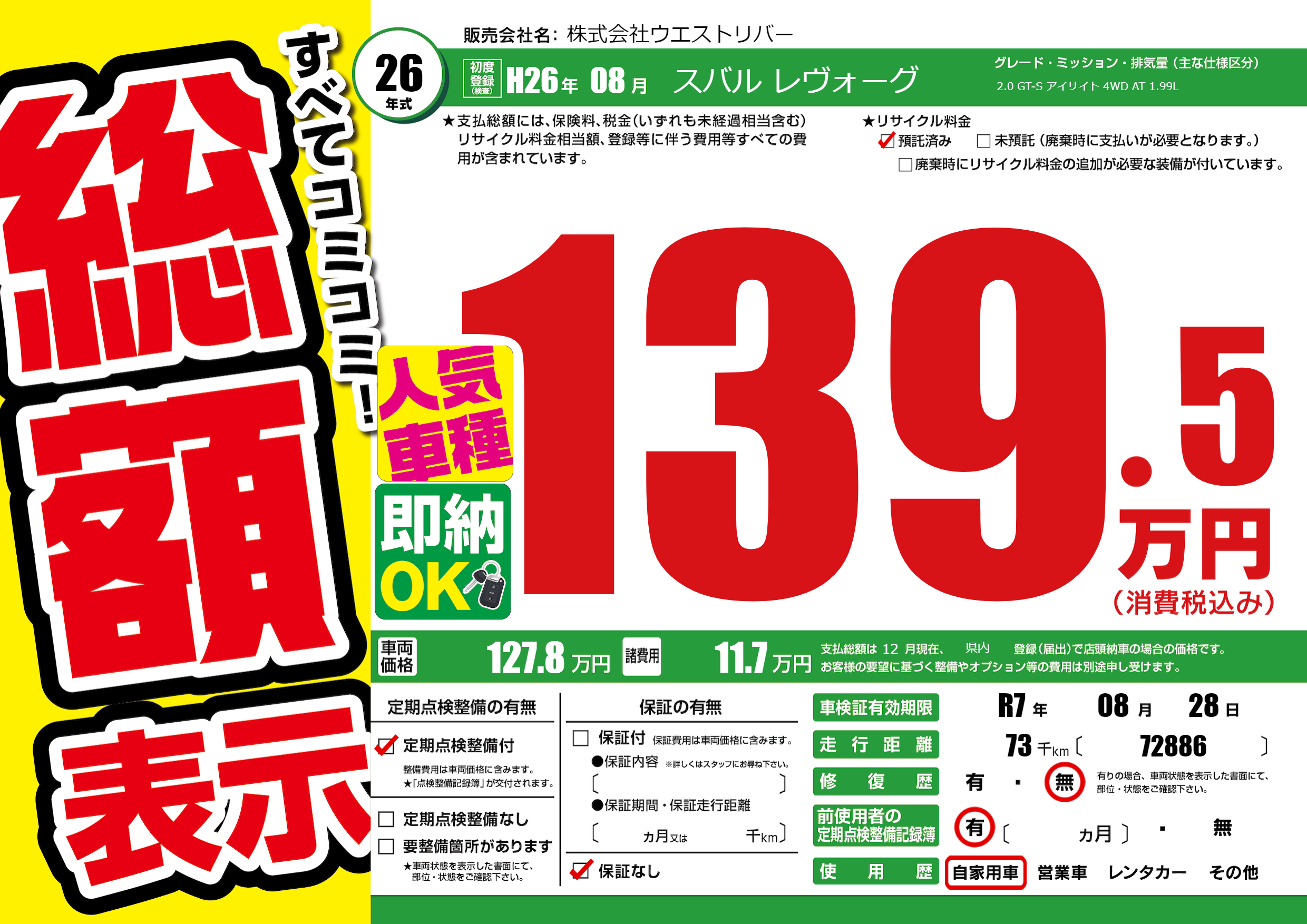 | 走行キロ | 7.3万km | 初年度登録 | H26年08月 |