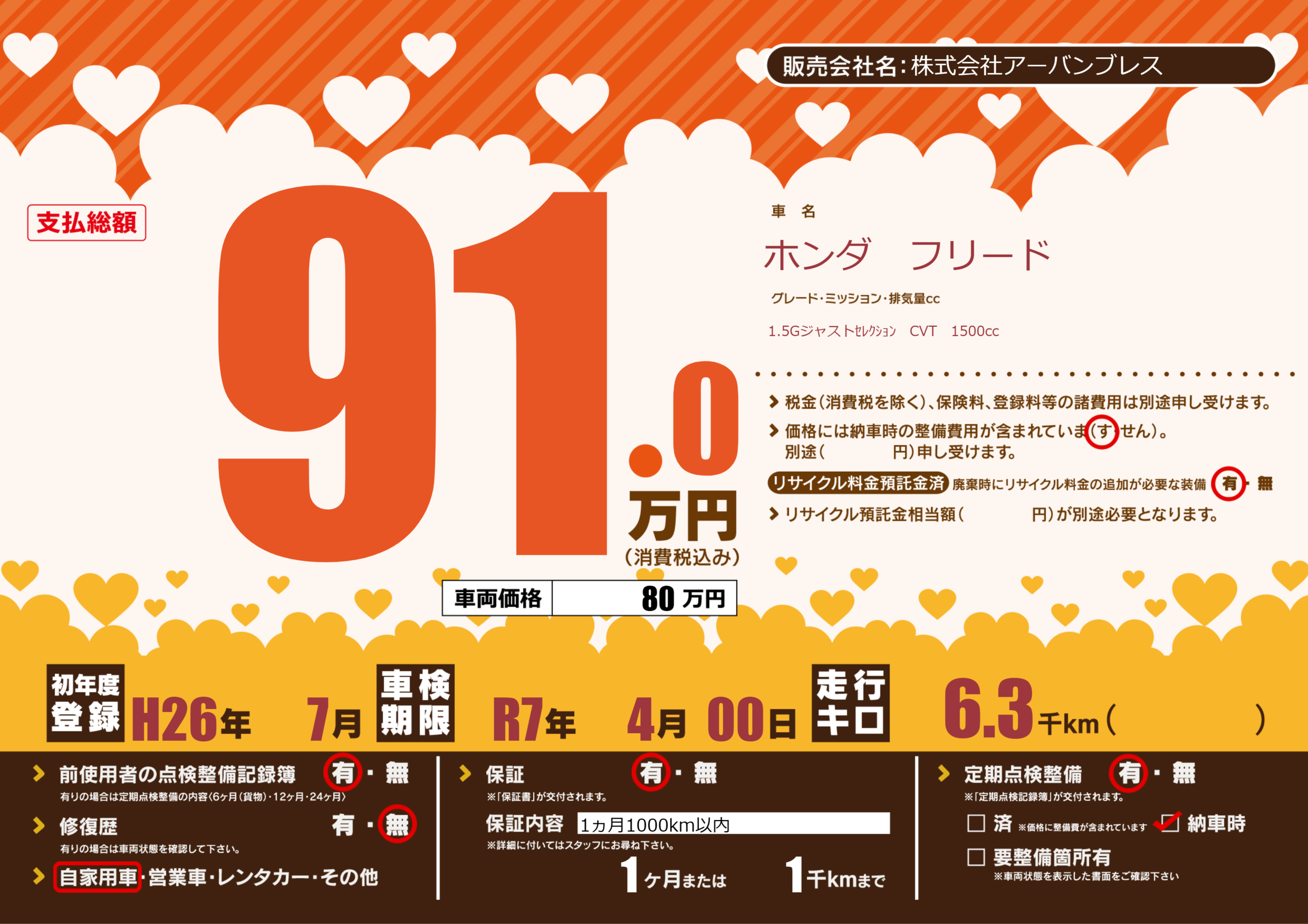 | 車名 | ホンダ フリード | グレード ミッション 排気量 |