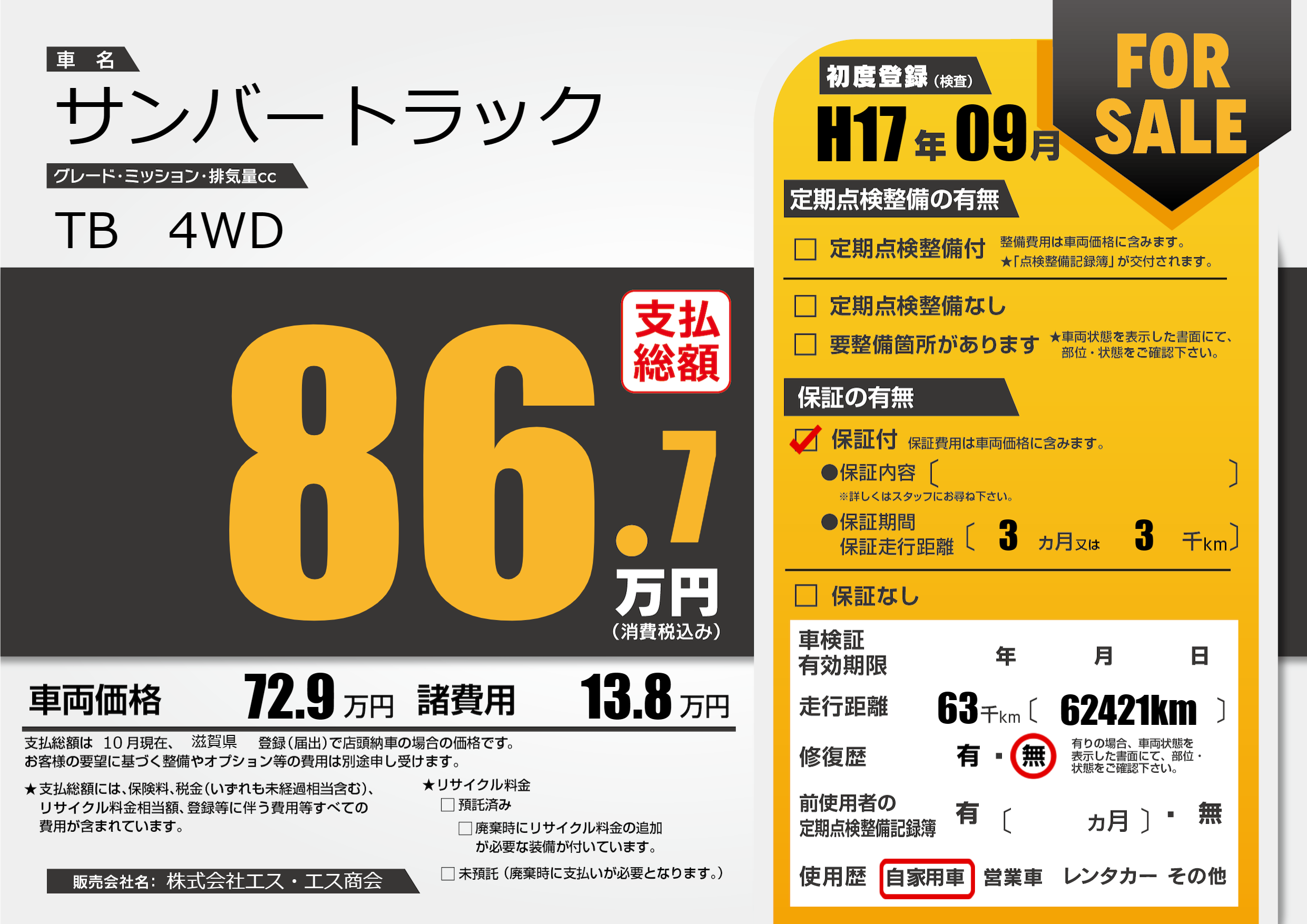| 車名 | サンバートラック | グレード ミッション 排気量 |