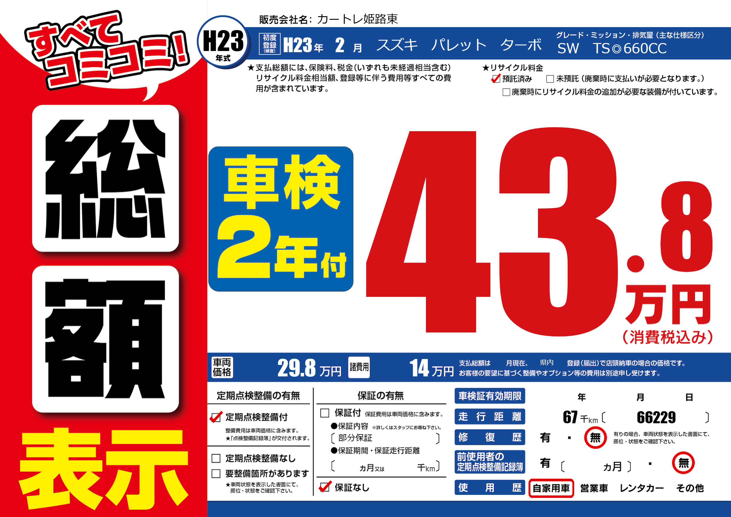 | 走行キロ | 6.7万km | 初年度登録 | H23年2月 |