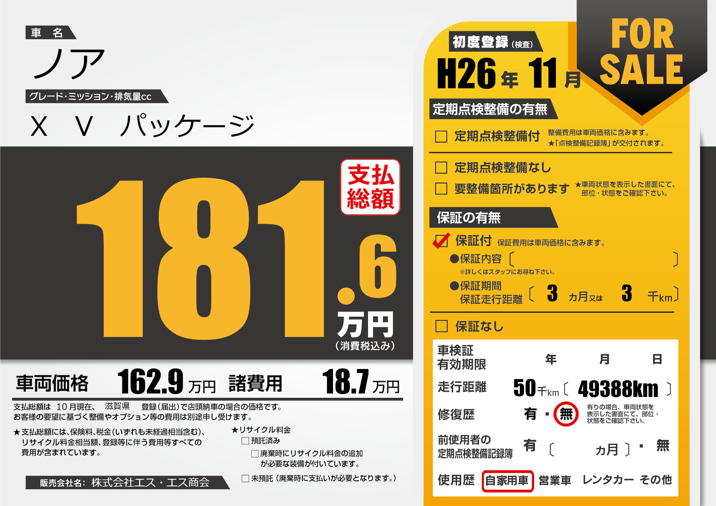 | 走行キロ | 5万km | 初年度登録 | H26年11月 |