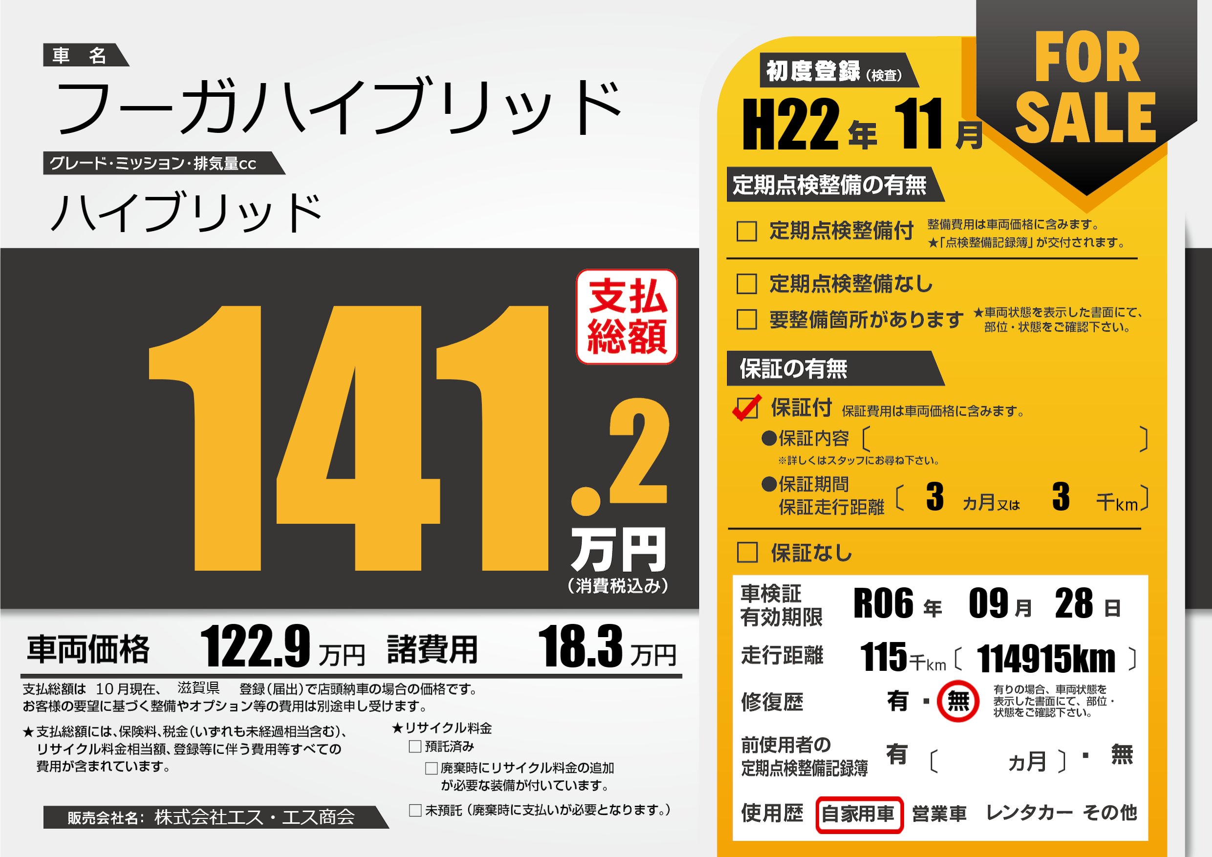 | 走行キロ | 11.5万km | 初年度登録 | H22年11月 |