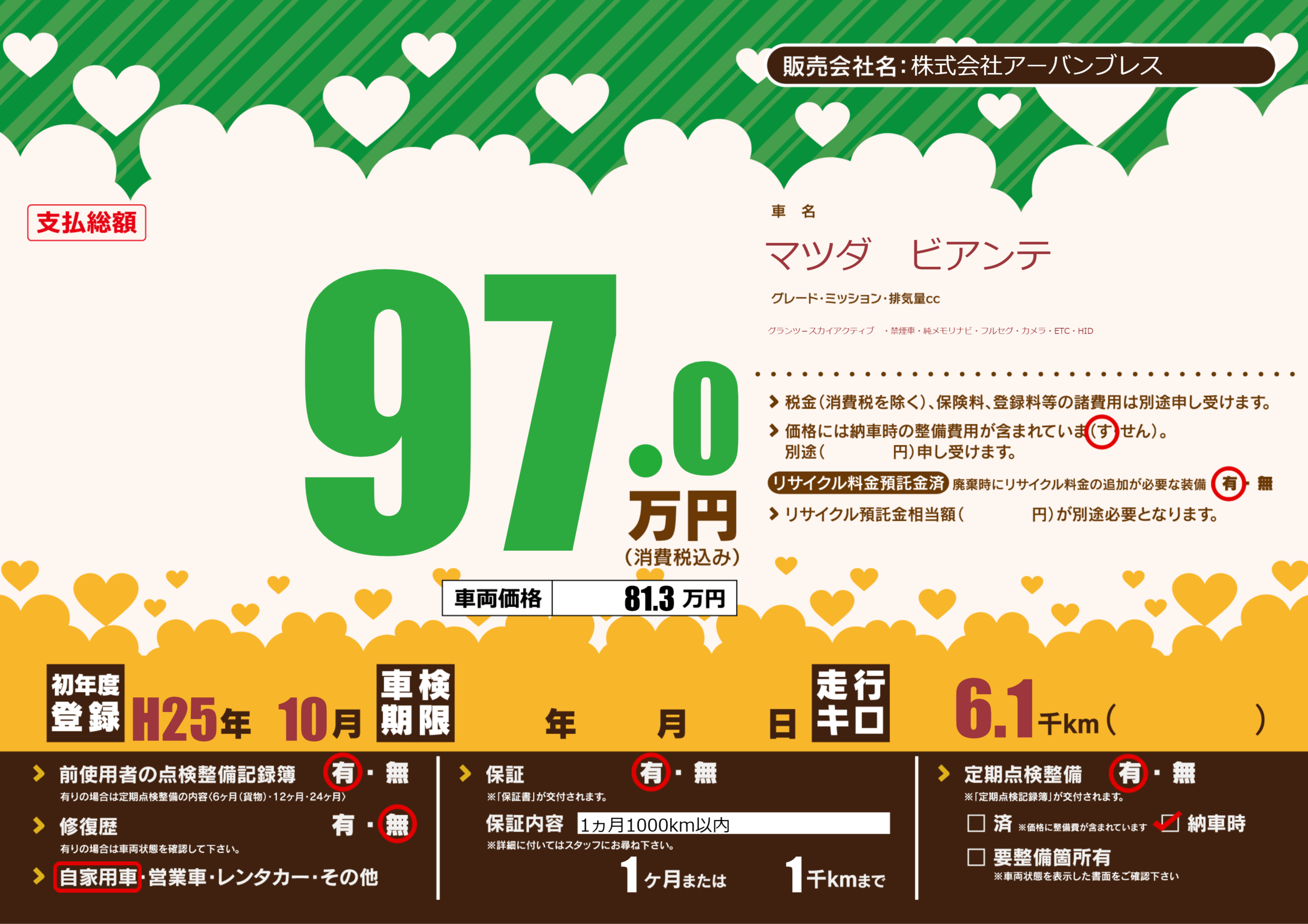 | 定期点検整備 | 定期点検整備あり 納車時あり | ||