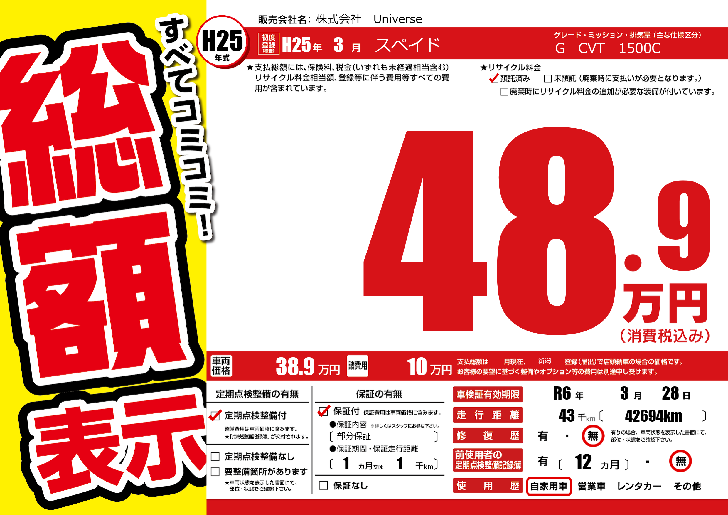| 車名 | スペイド | グレード ミッション 排気量 |