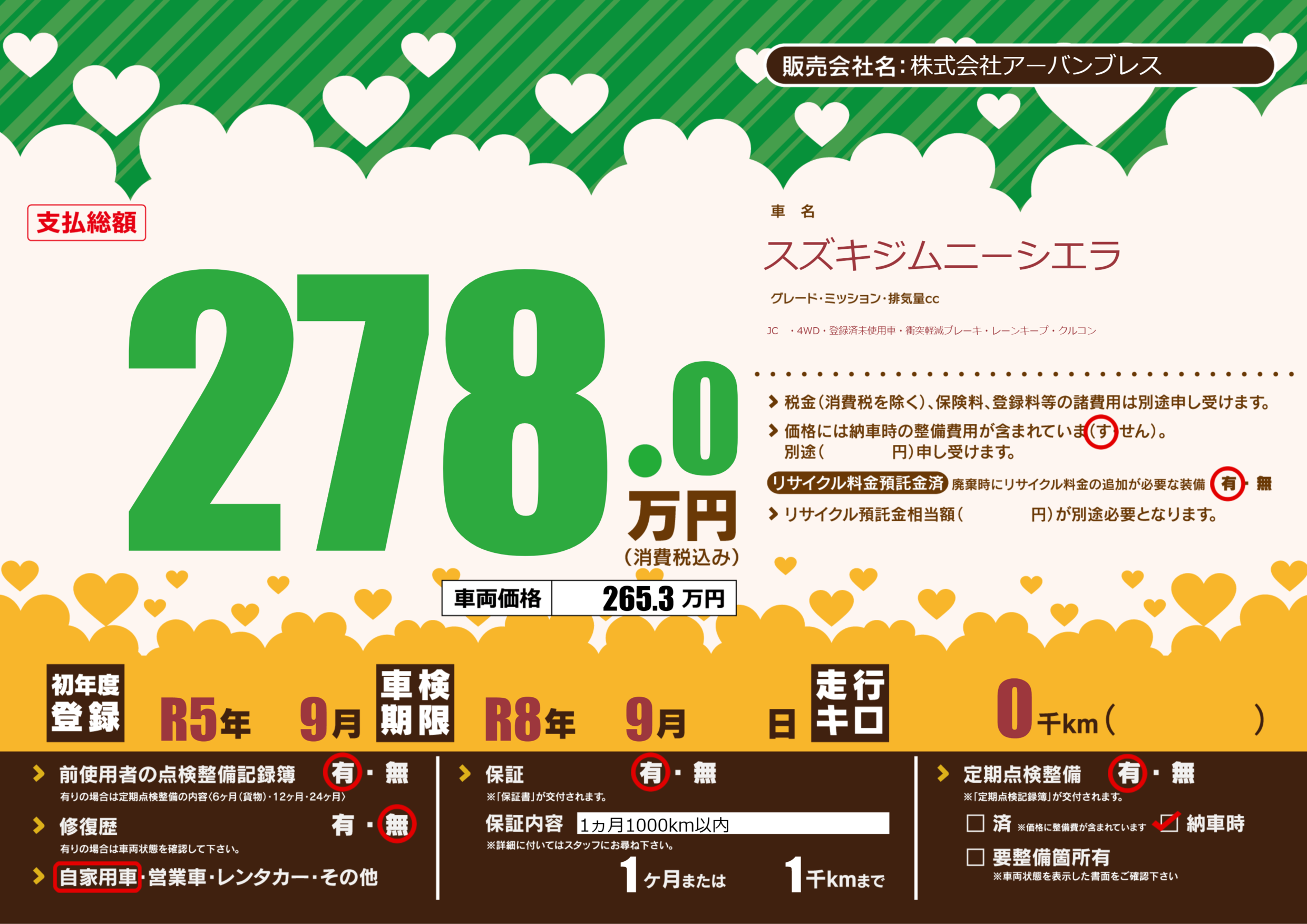 | 車名 | スズキジムニーシエラ | グレード ミッション 排気量 |