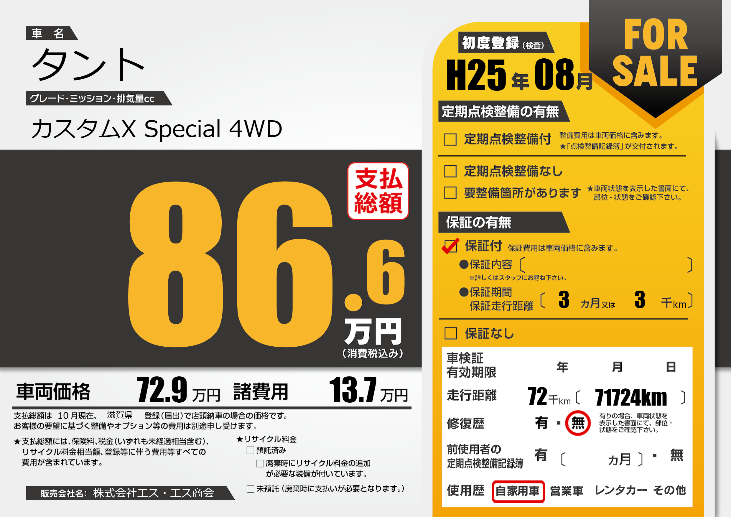| 走行キロ | 7.2万km | 初年度登録 | H25年08月 |