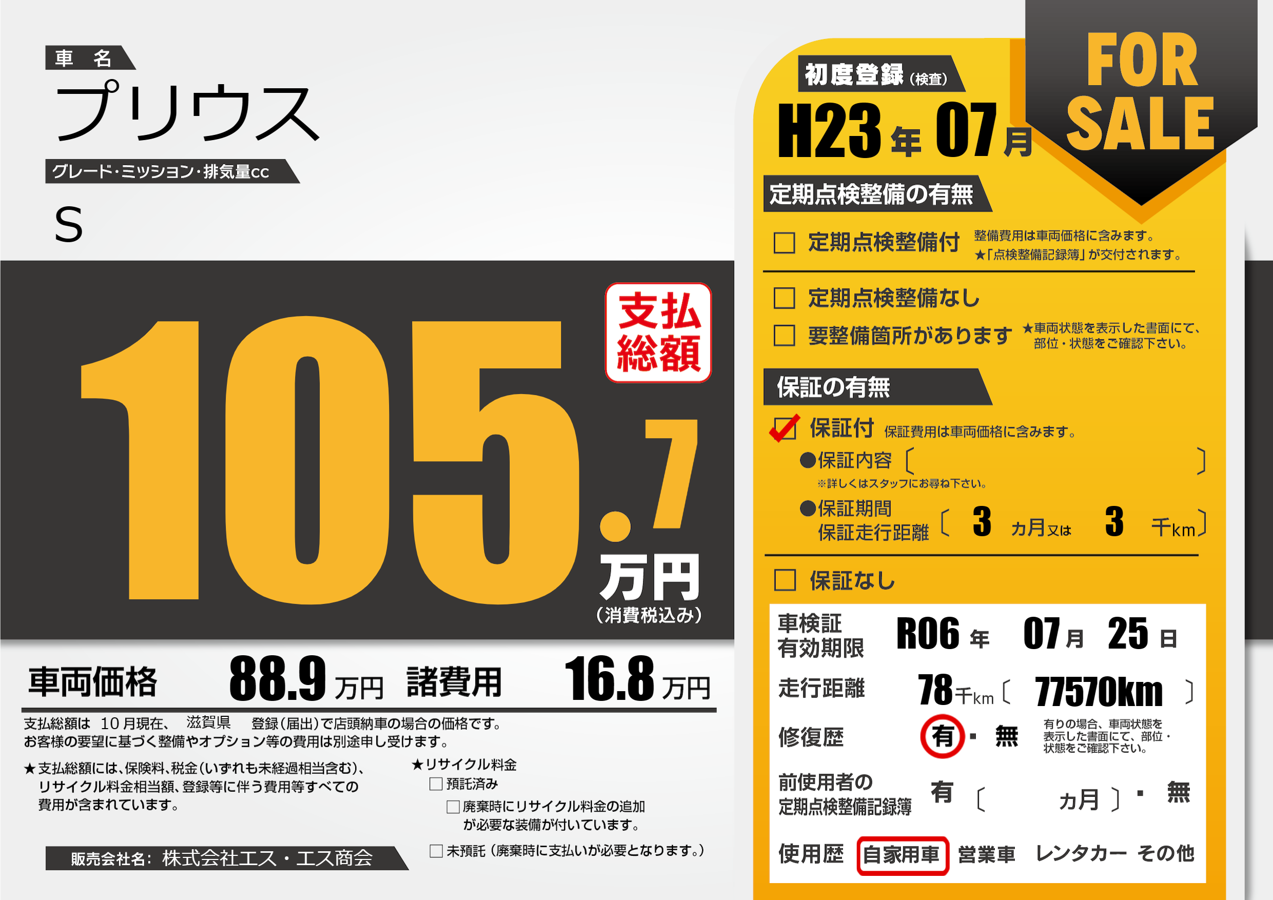 | 車名 | プリウス | グレード ミッション 排気量 |