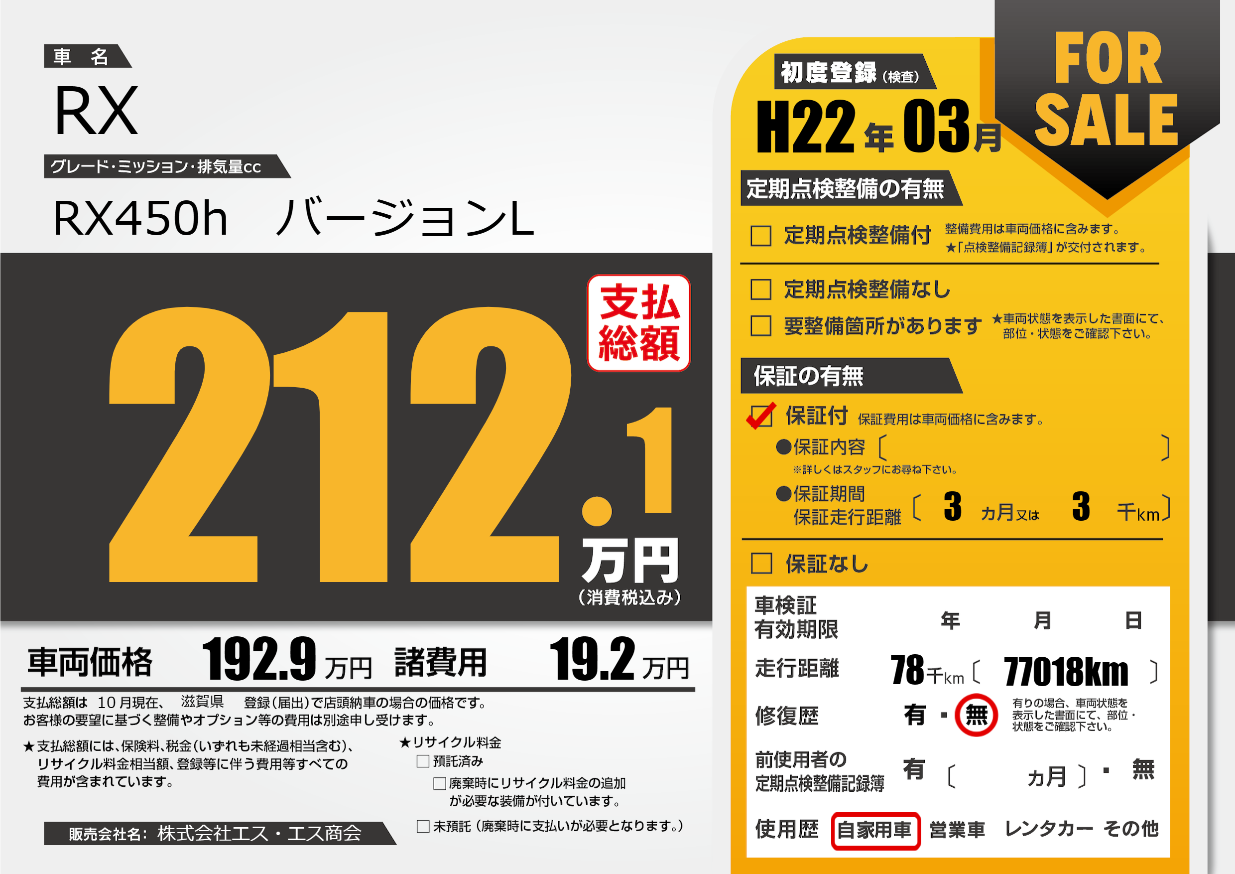 | 走行キロ | 7.8万km | 初年度登録 | H22年03月 |
