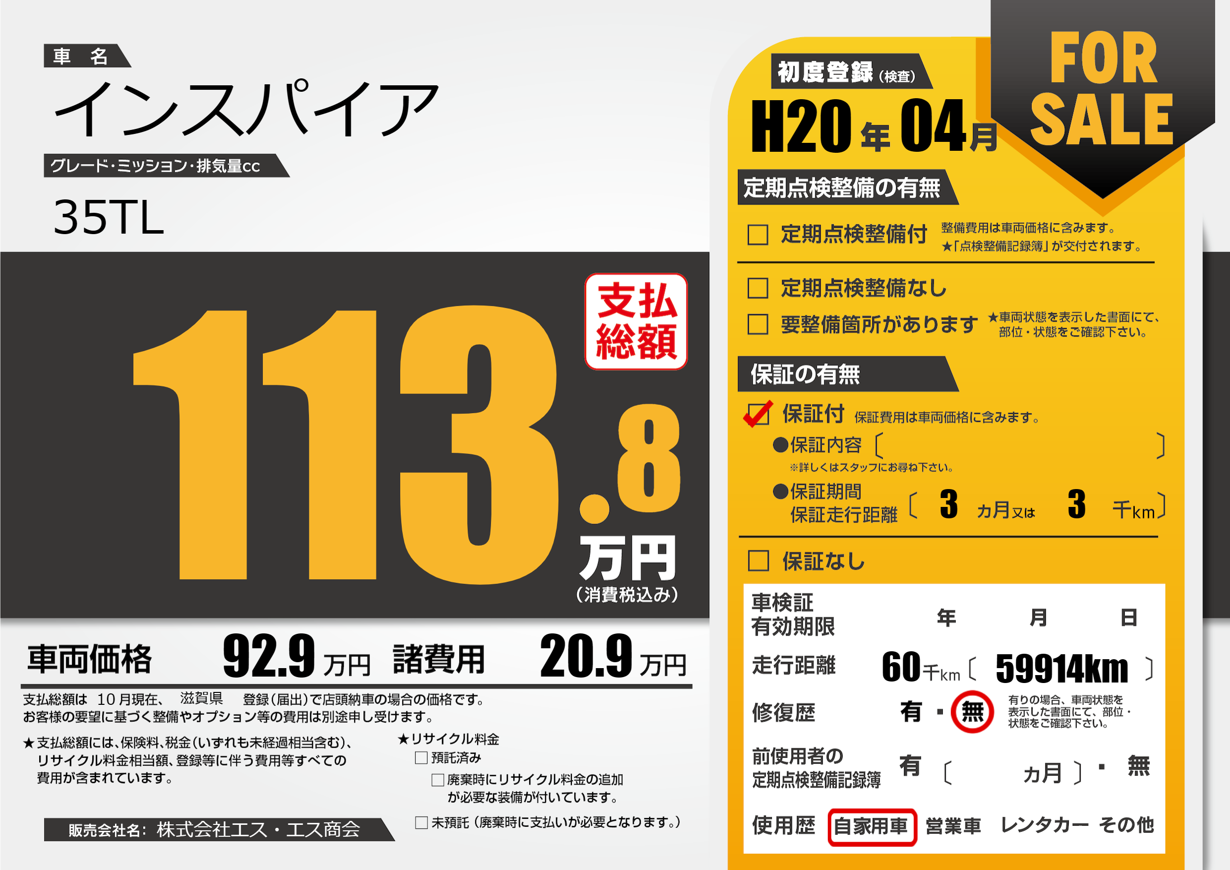 | 車名 | インスパイア | グレード ミッション 排気量 |