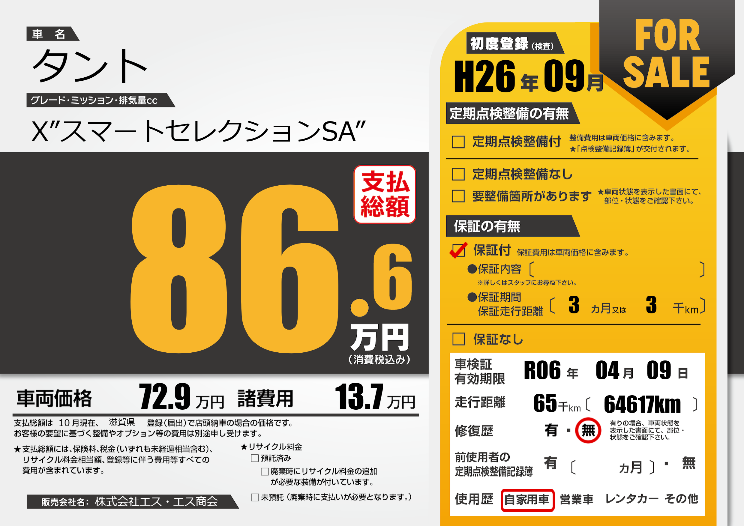 | 走行キロ | 6.5万km | 初年度登録 | H26年09月 |
