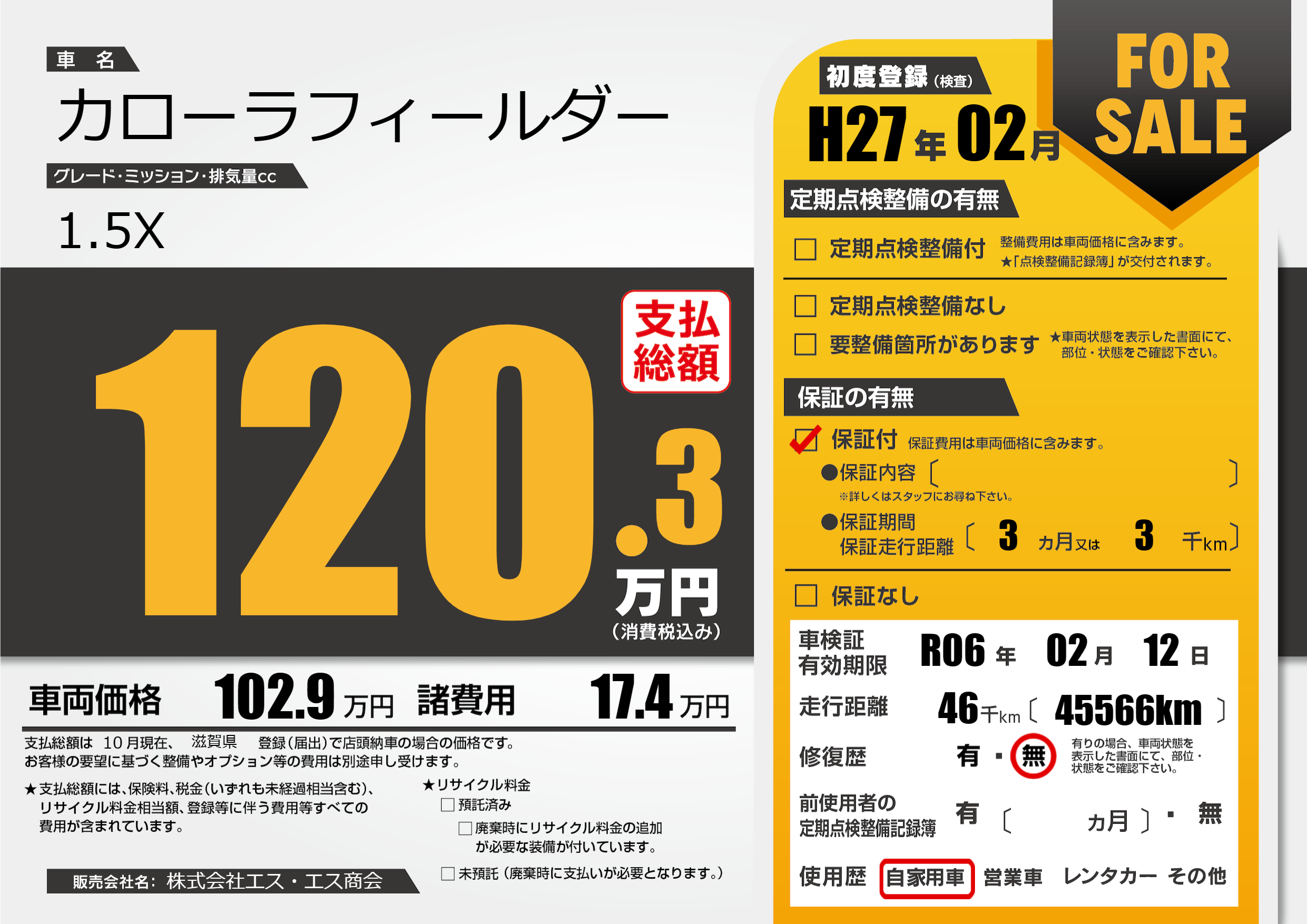 | 車名 | カローラフィールダー | グレード ミッション 排気量 |