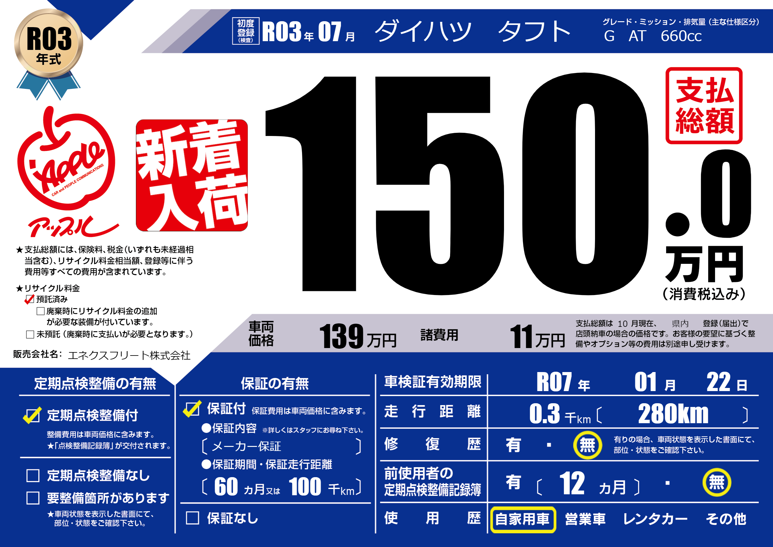 | 走行キロ | - | 初年度登録 | R03年07月 |
