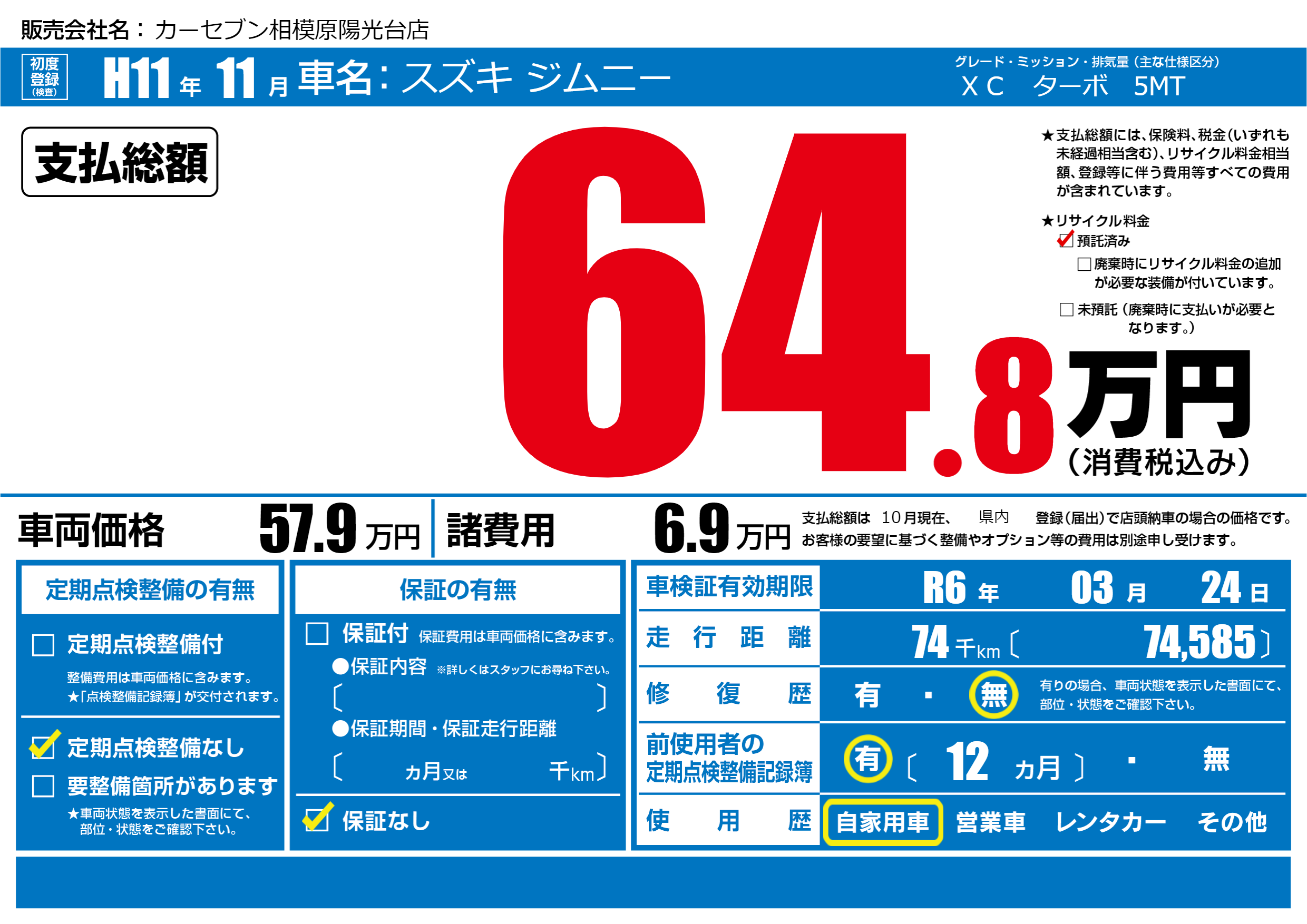 | 車名 | スズキ ジムニー | グレード ミッション 排気量 |