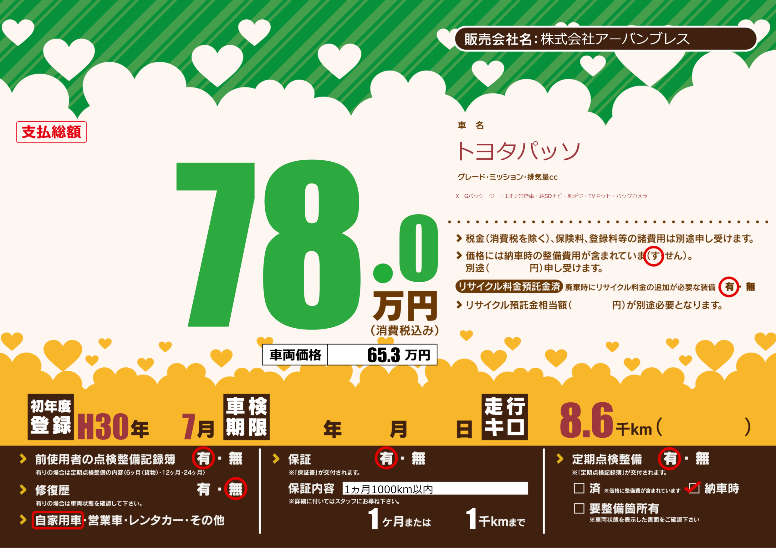 | 車名 | トヨタパッソ | グレード ミッション 排気量 |