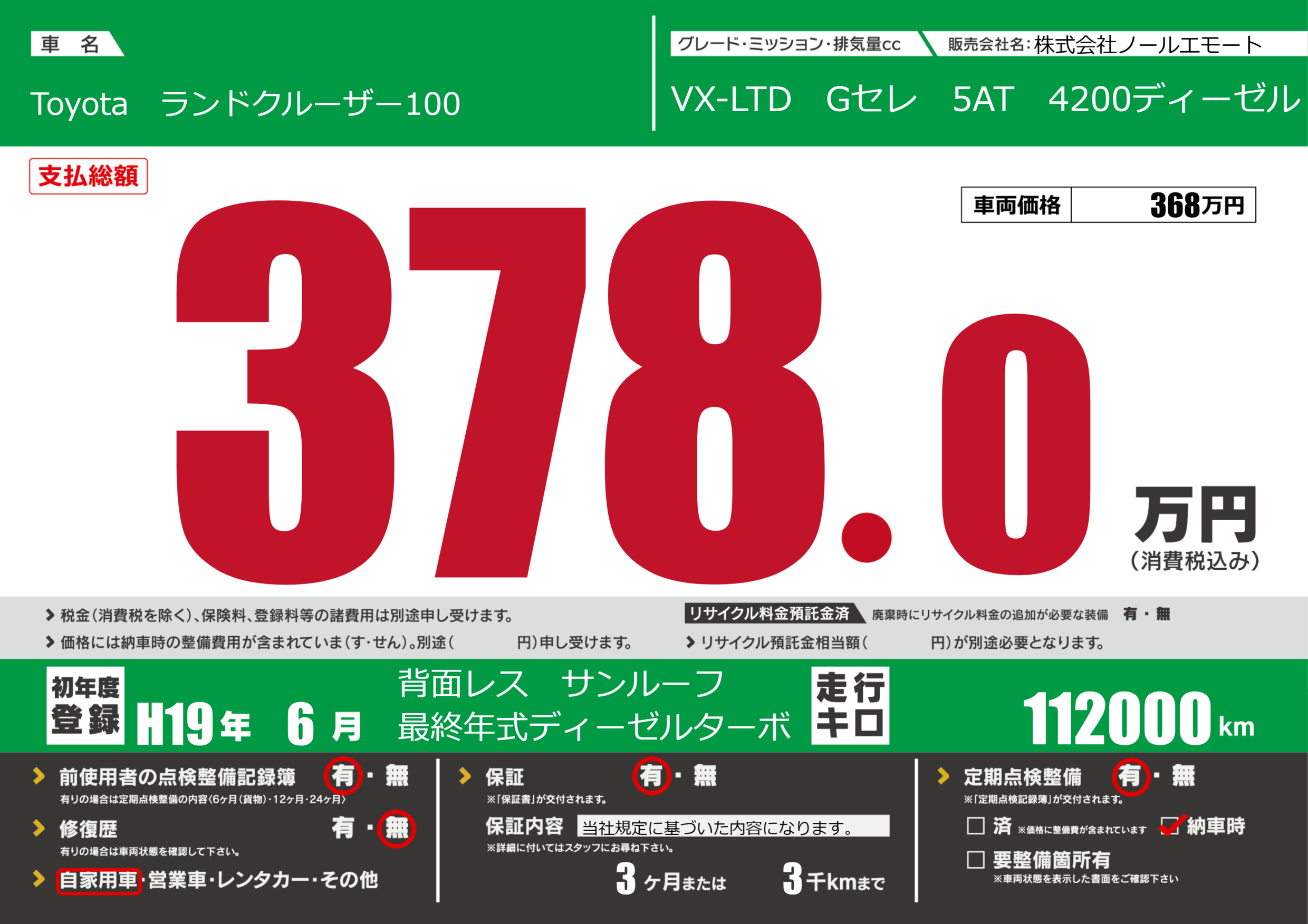| 定期点検整備 | 定期点検整備あり 納車時あり | ||
