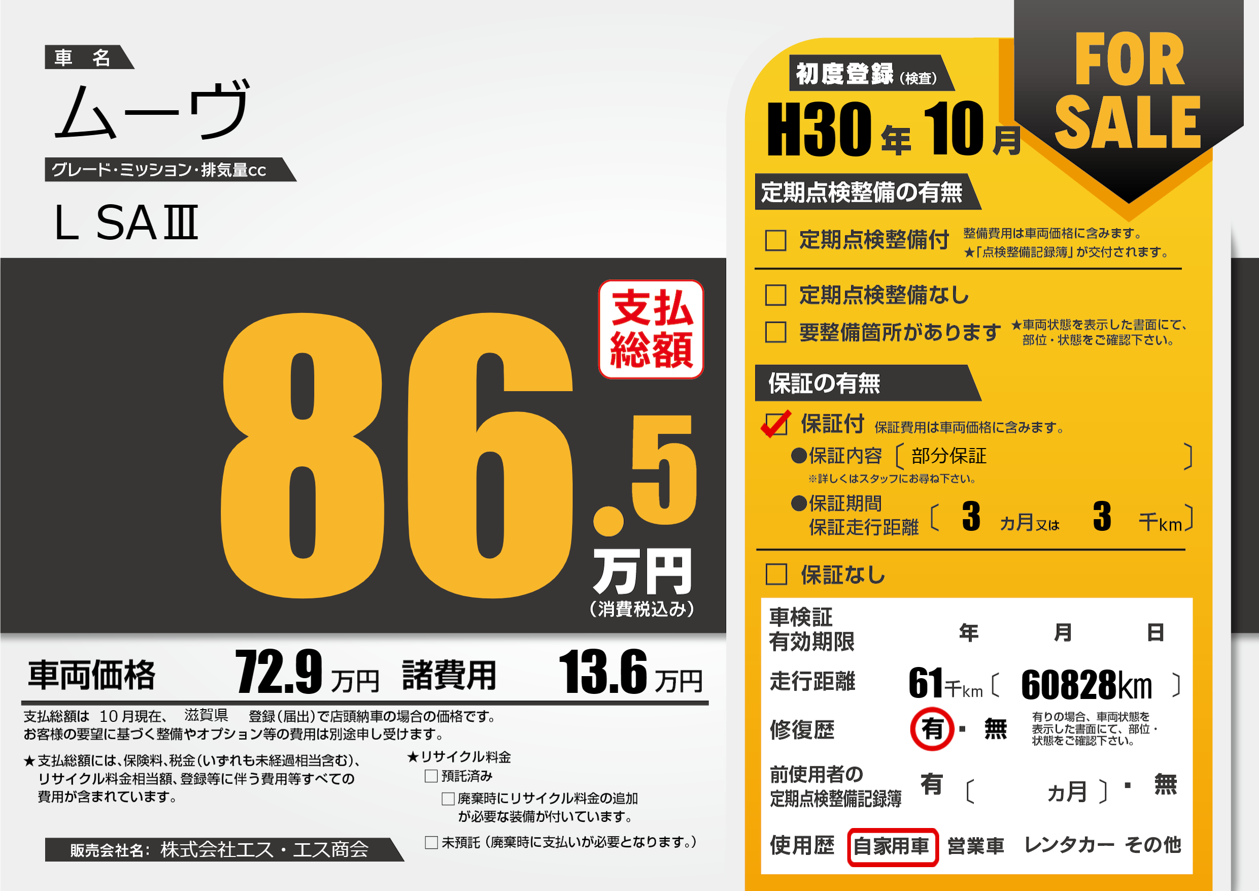 | 走行キロ | 6.1万km | 初年度登録 | H30年10月 |