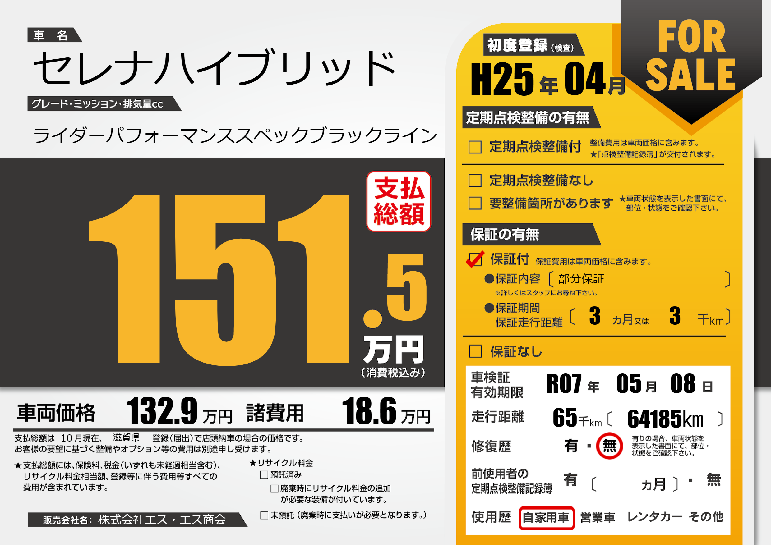 | 車名 | セレナハイブリッド | グレード ミッション 排気量 |