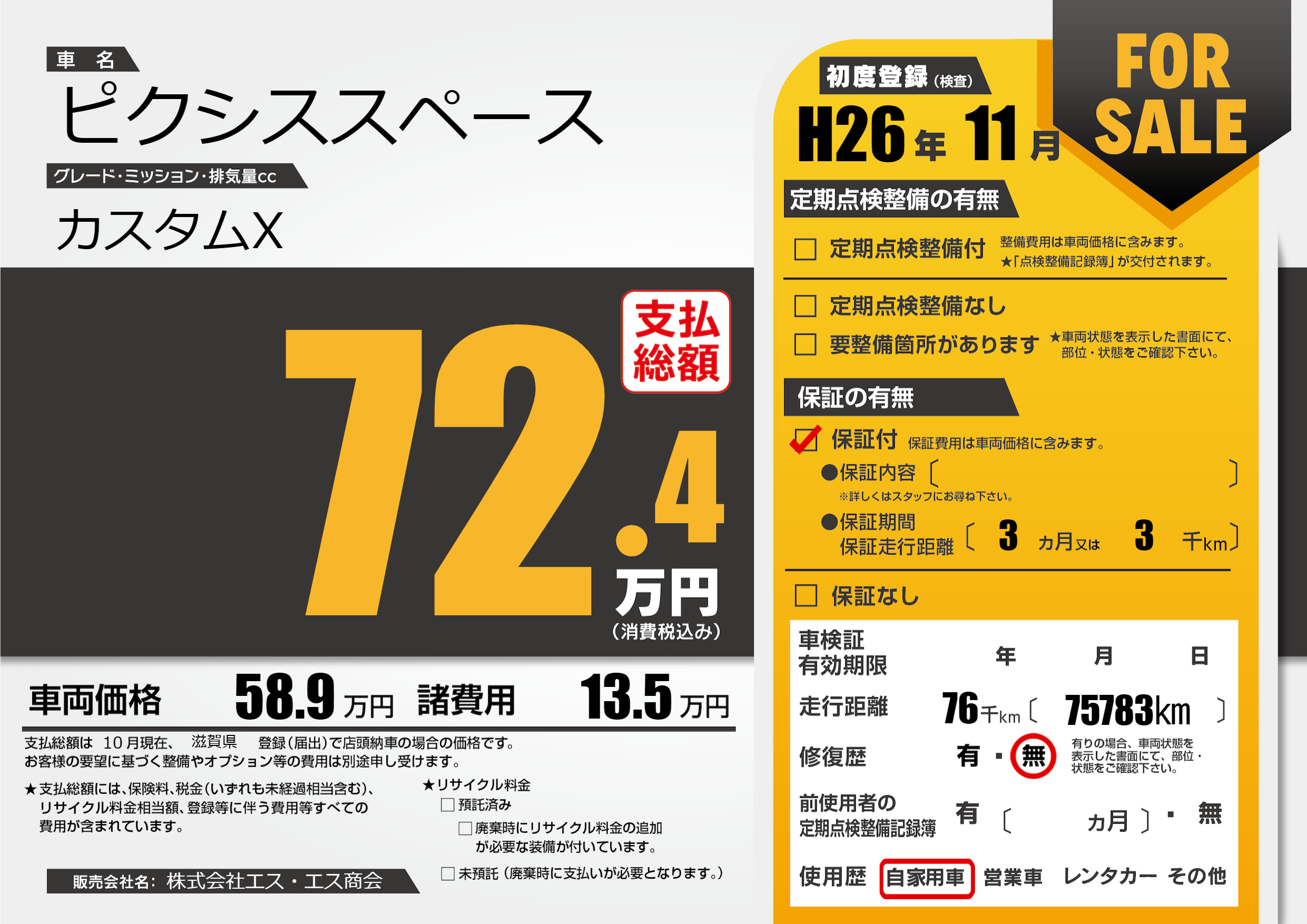 | 車名 | ピクシススペース | グレード ミッション 排気量 |