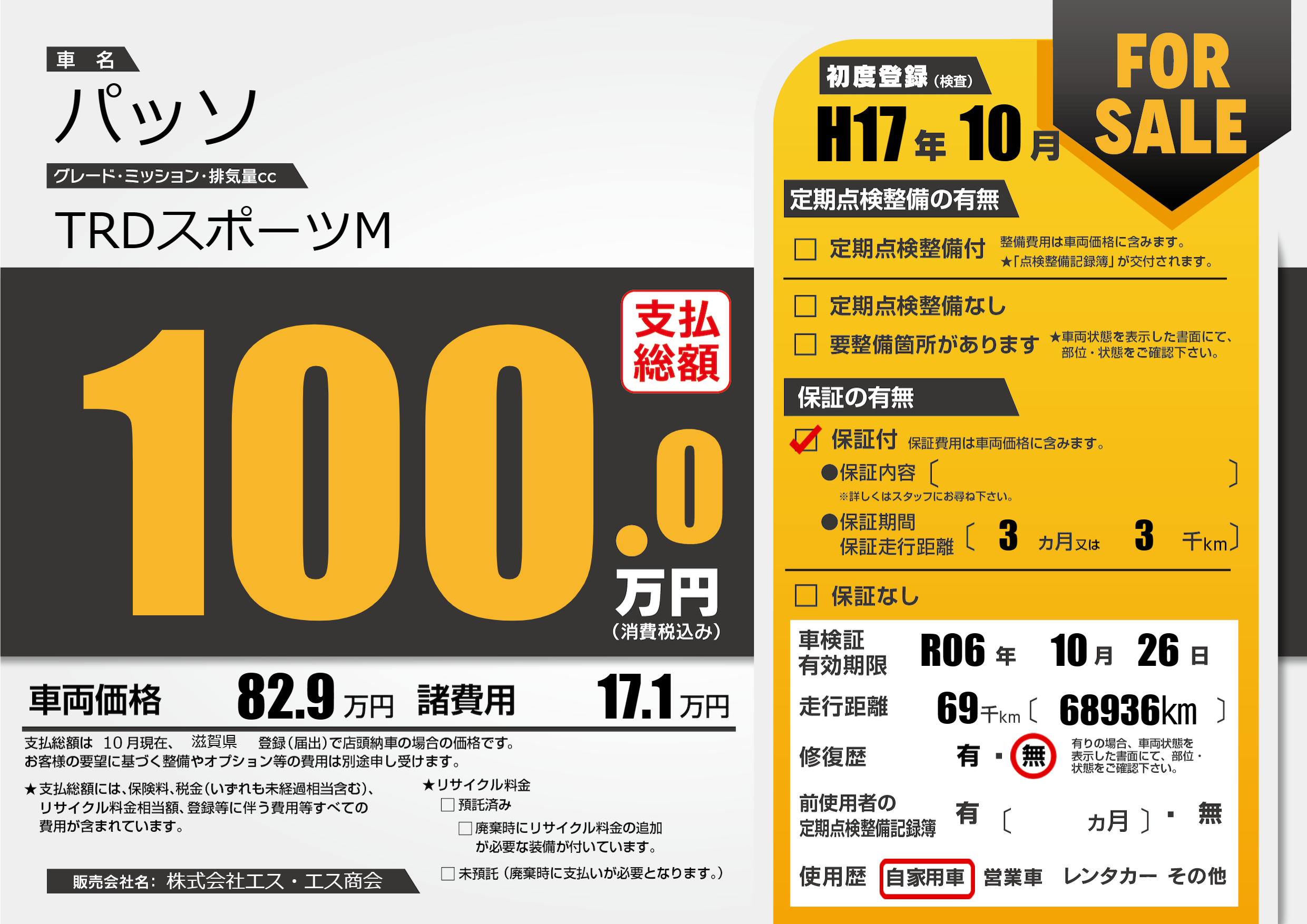 | 車名 | パッソ | グレード ミッション 排気量 |