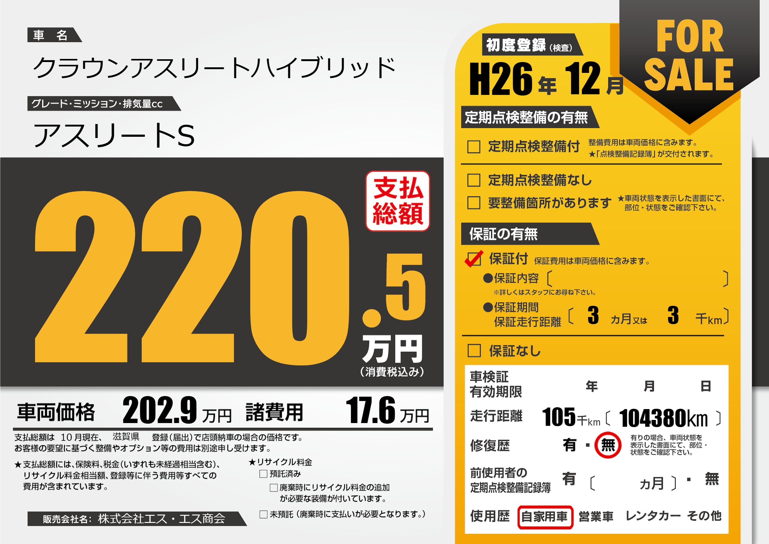| 車名 | クラウンアスリートハイブリッド | グレード ミッション 排気量 |