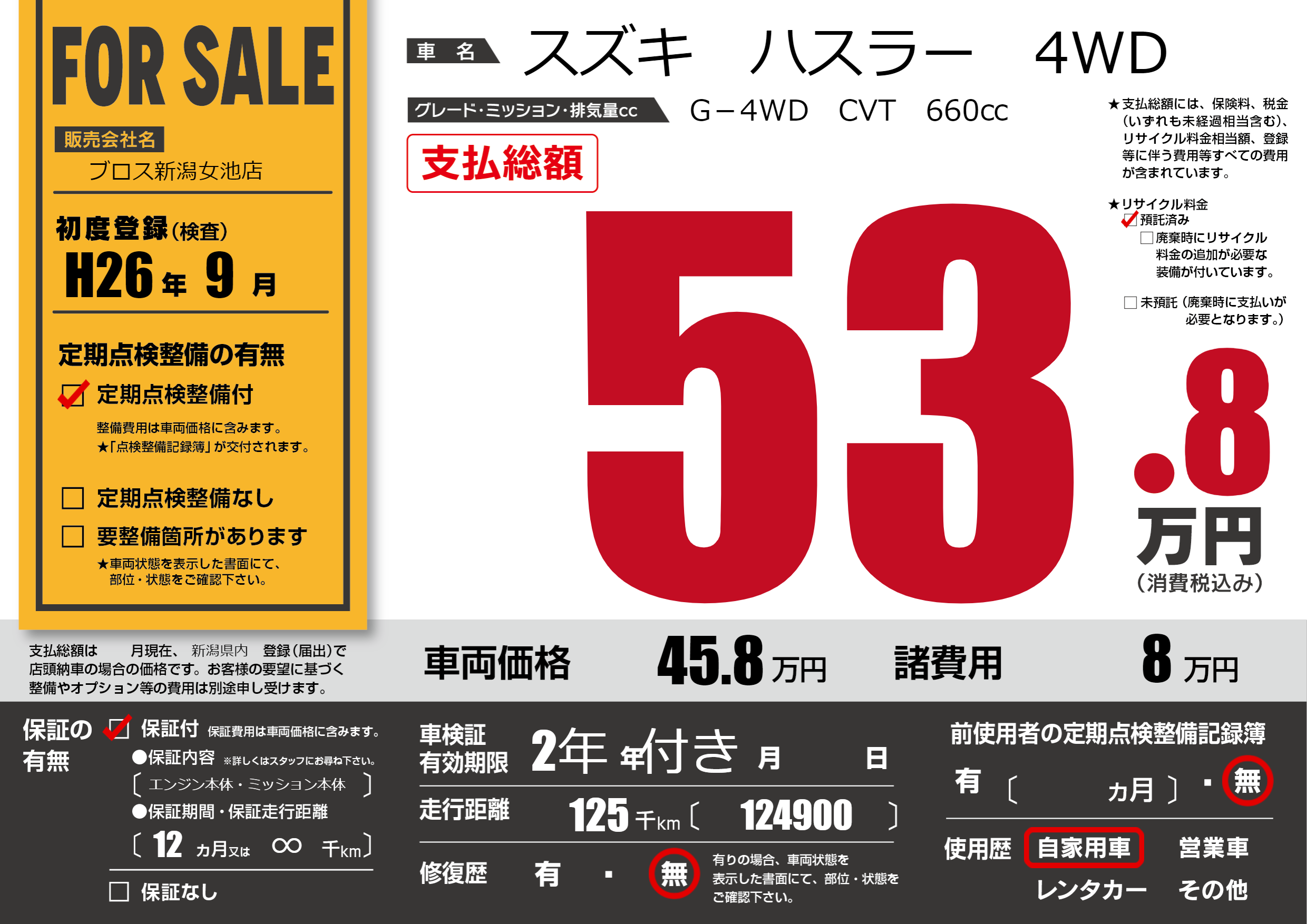 | 車名 | スズキ ハスラー 4WD | グレード ミッション 排気量 |