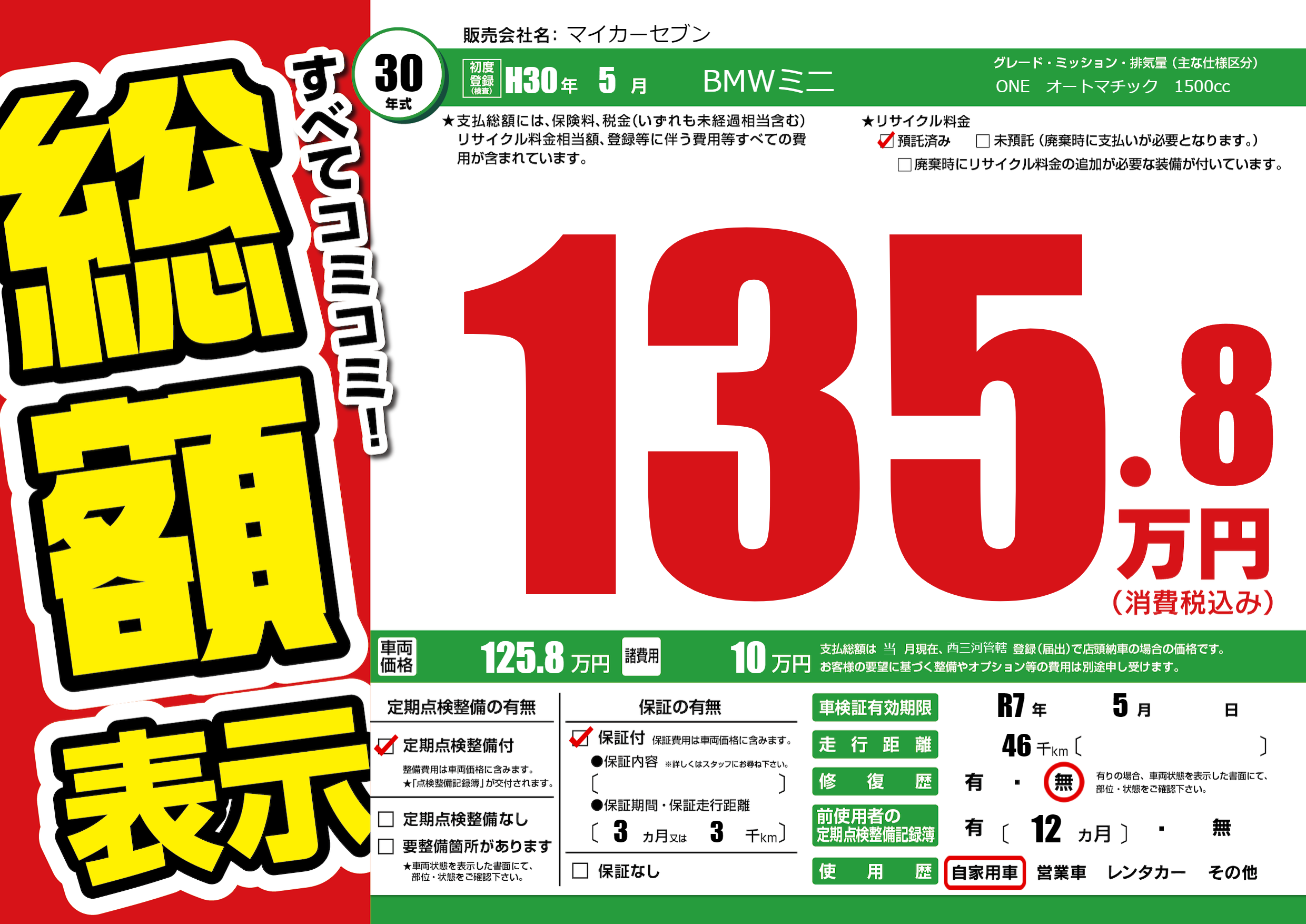 | 車検制限 | R7年 5月 - 日 | ||
