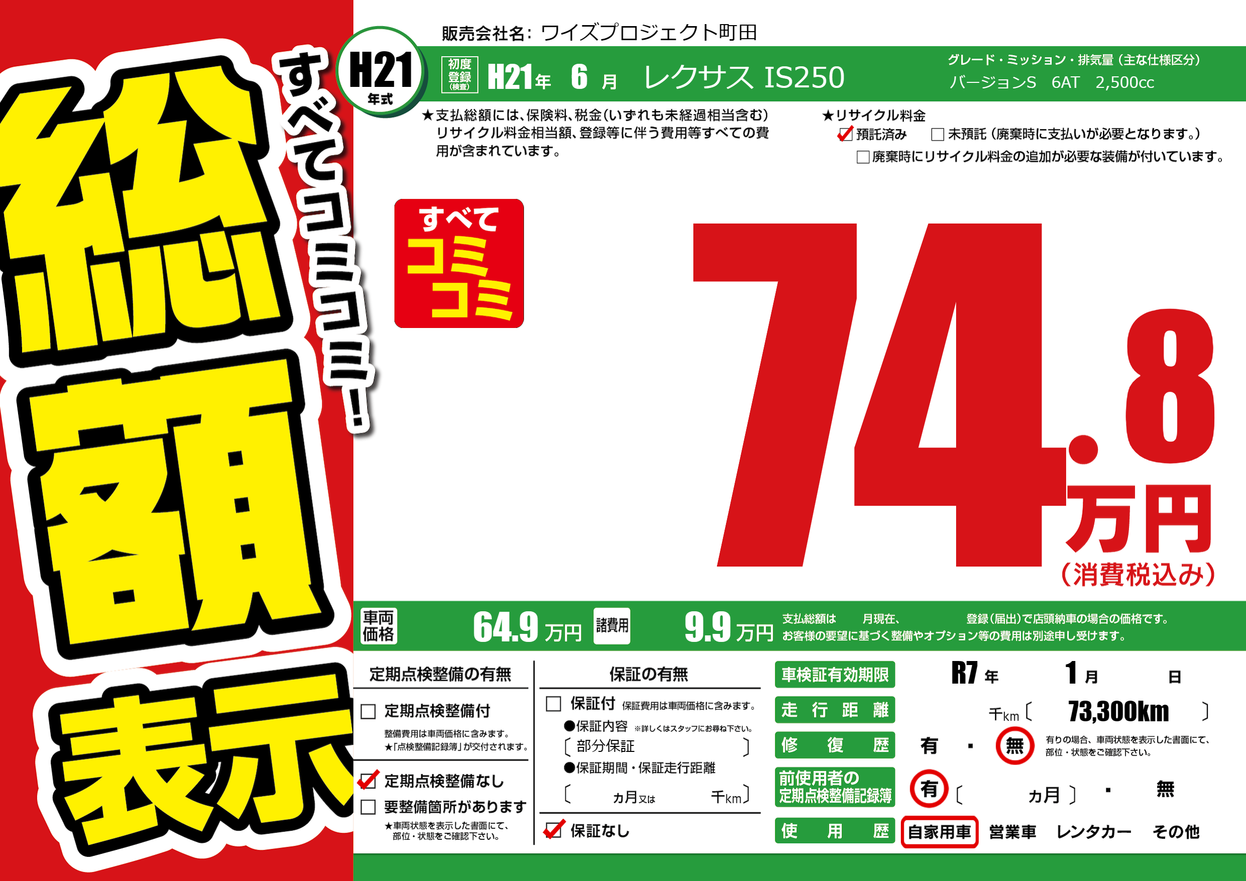 | 車名 | レクサス IS250 | グレード ミッション 排気量 |