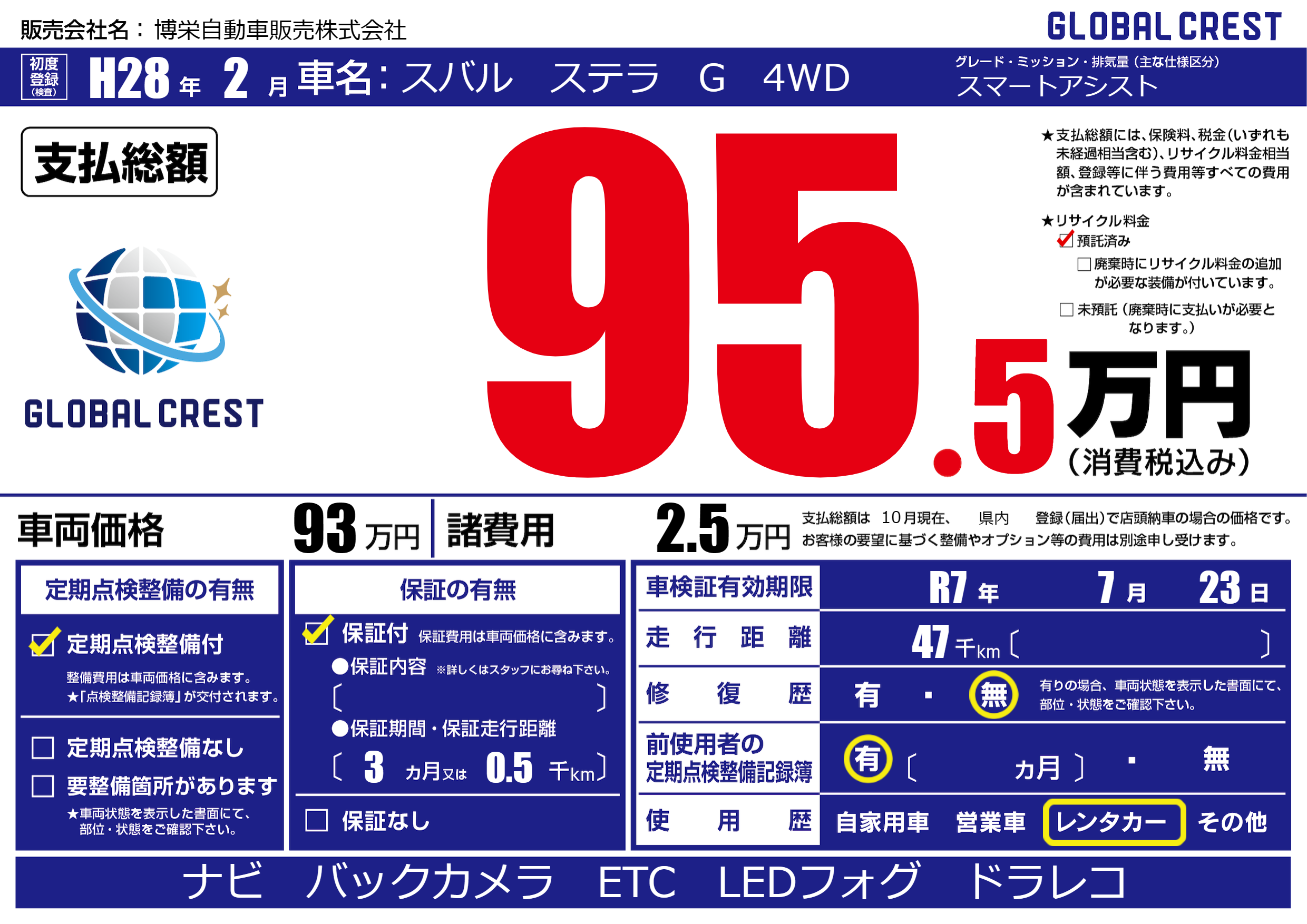 | 車名 | スバル ステラ G 4WD | グレード ミッション 排気量 |