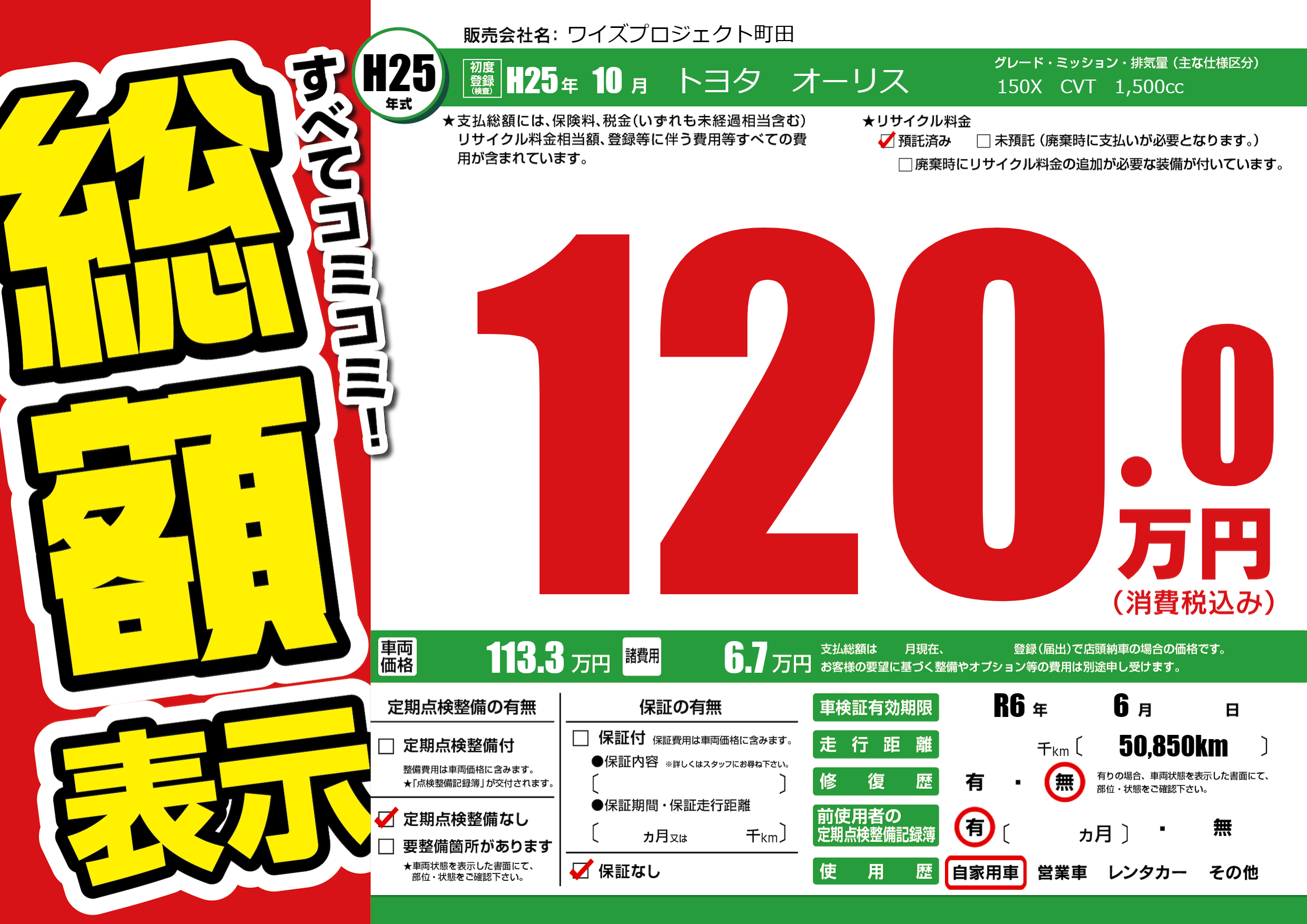 | 車名 | トヨタ オーリス | グレード ミッション 排気量 |