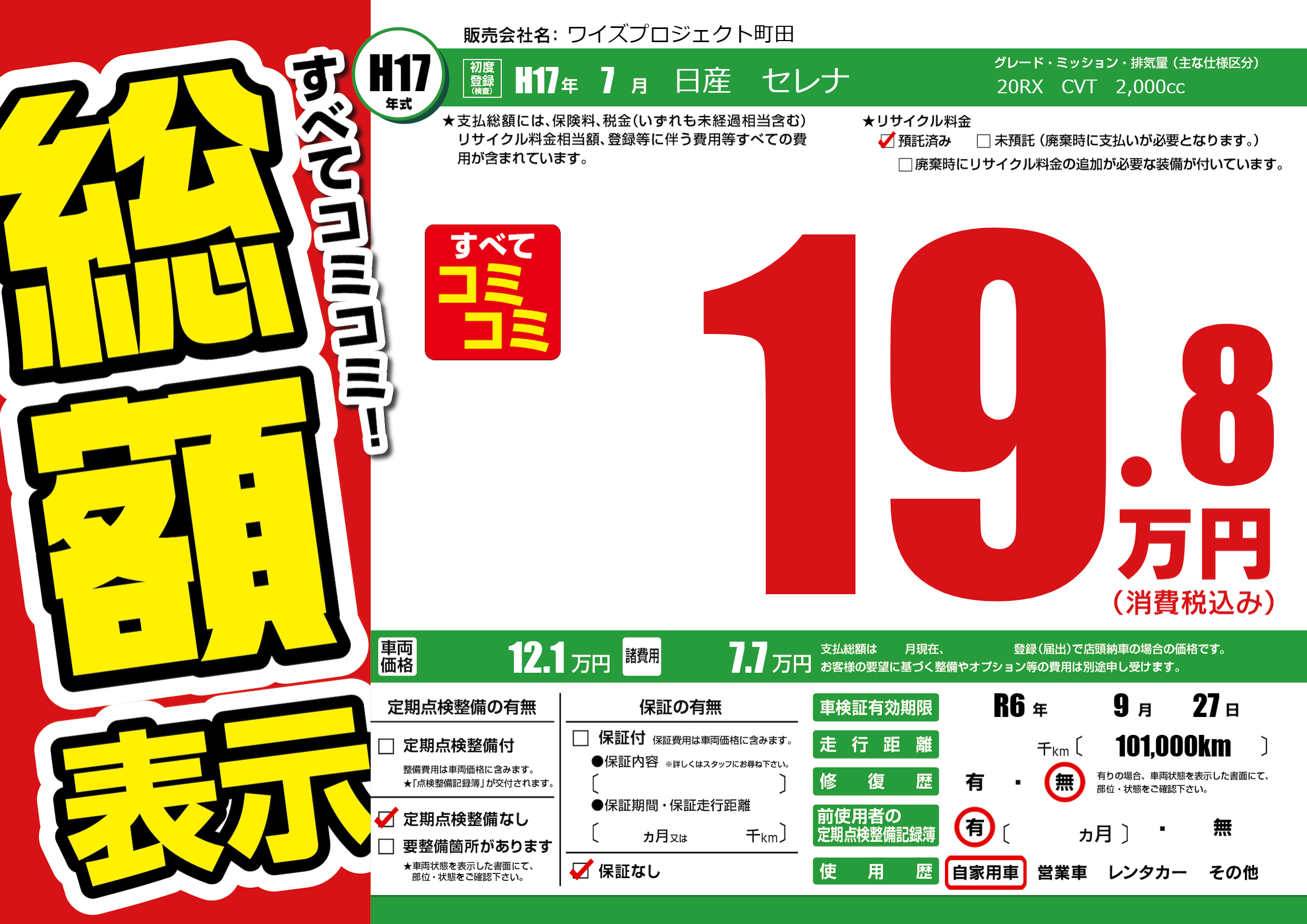 | 車名 | 日産 セレナ | グレード ミッション 排気量 |
