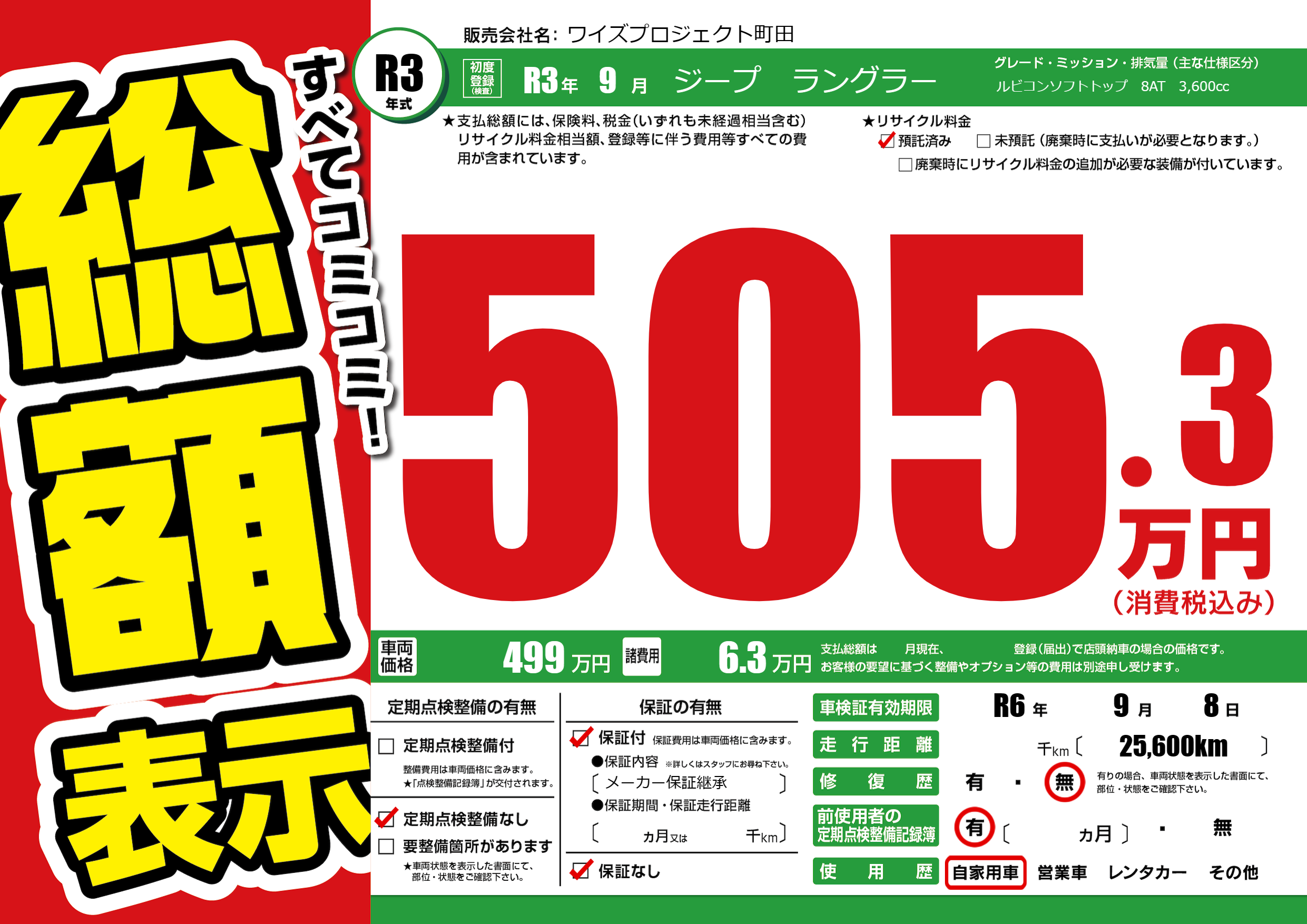 | 車名 | ジープ ラングラー | グレード ミッション 排気量 |