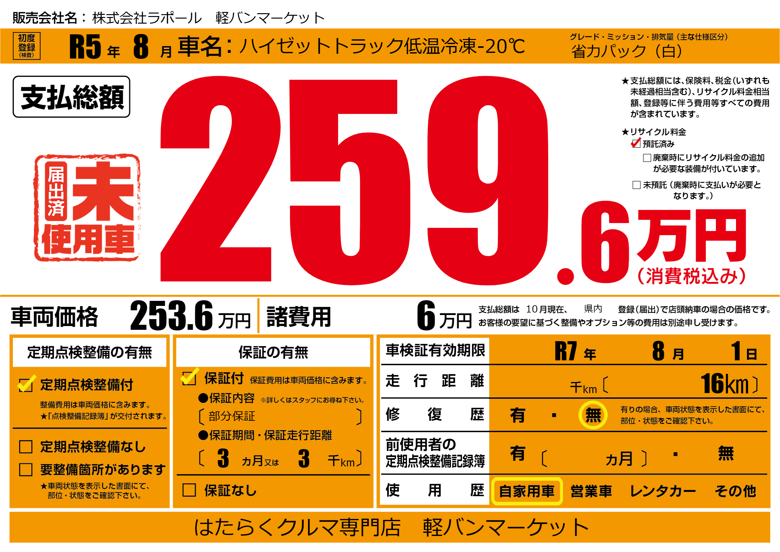 | 車名 | ハイゼットトラック低温冷凍-20℃ | グレード ミッション 排気量 |
