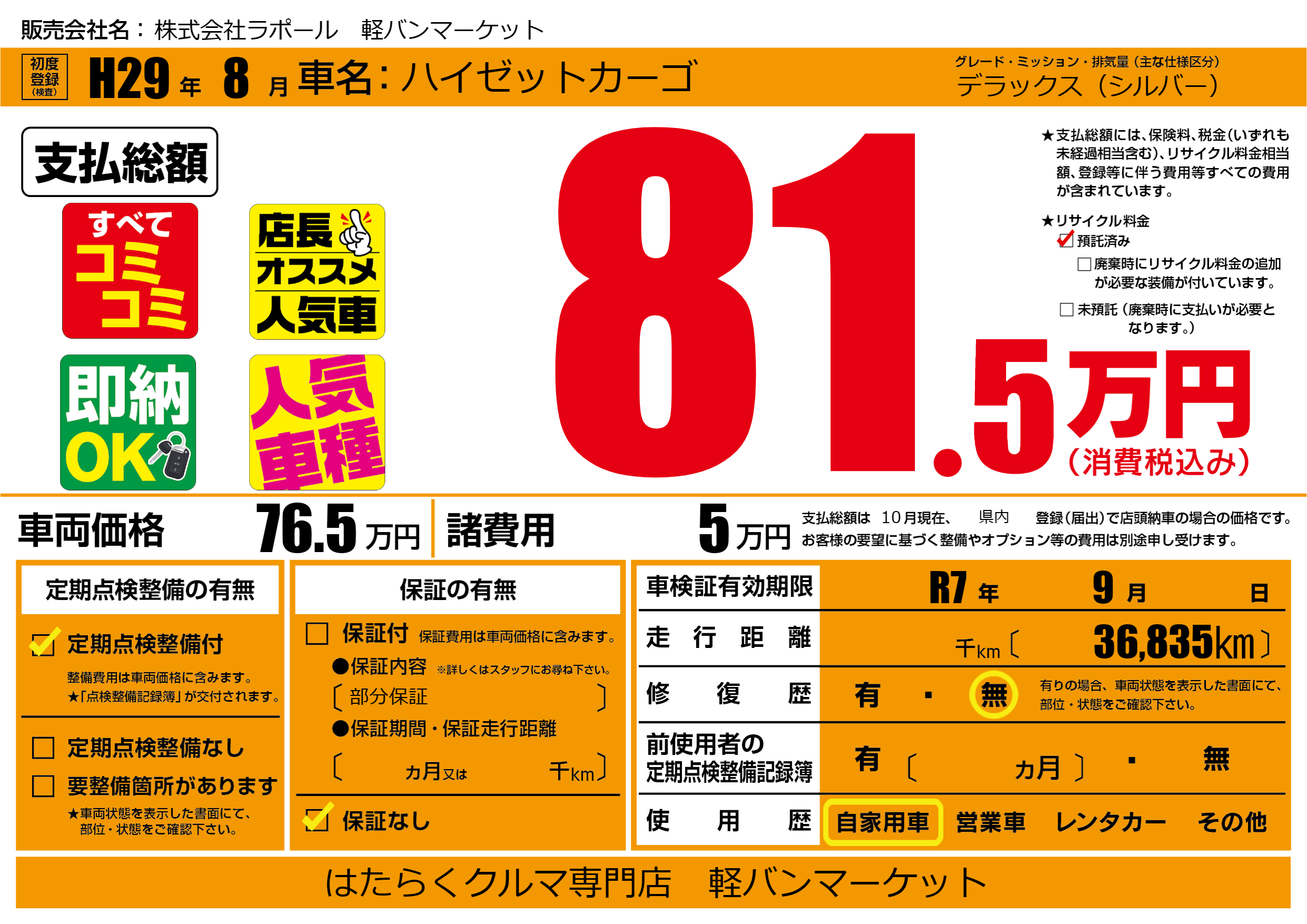 | 車検制限 | R7年 9月 - 日 | ||